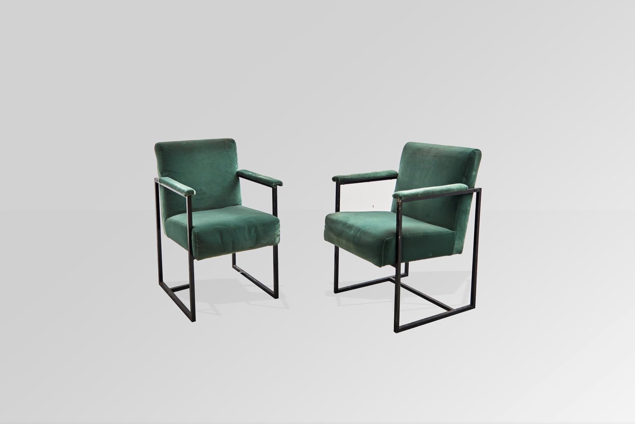 poltrone di Giancarlo Palanti per Studio Albini. struttura in metallo crea un sorprendente contrasto con il morbido velluto colore verde scuro