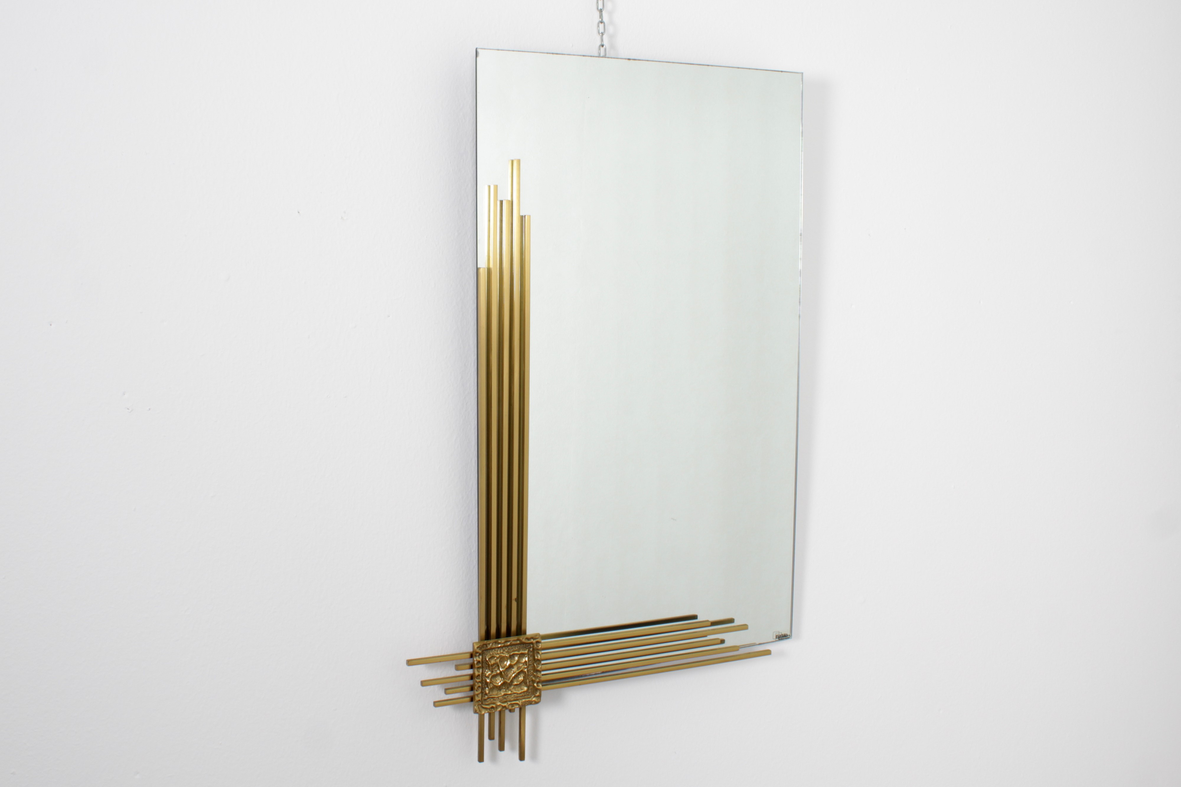 Specchio da parete, in bronzo e ottone. Di Angelo Brotto per Esperia, anni '70. Presenti etichetta adesiva con marchio, firma del designer incussa e a graffio.