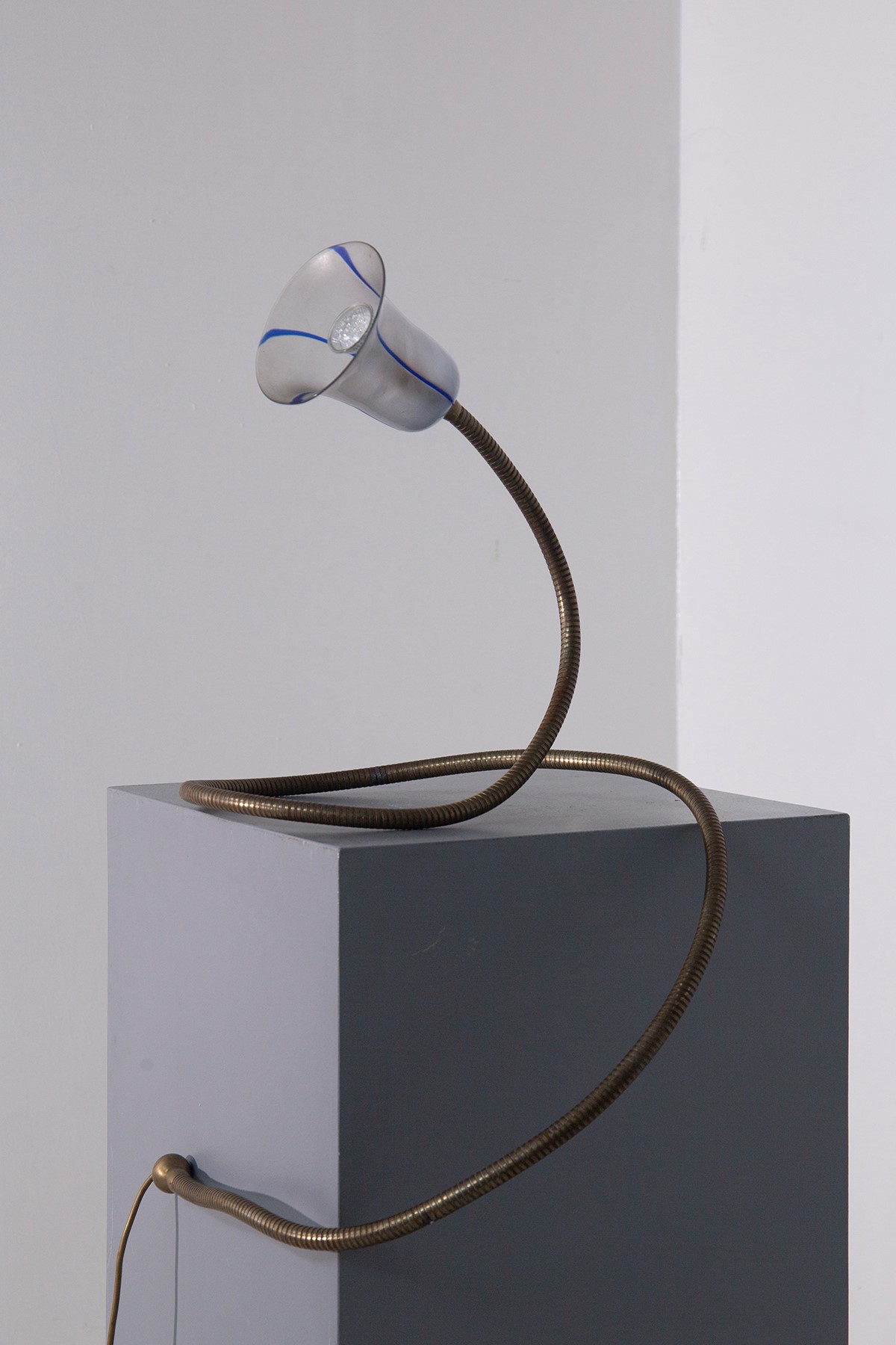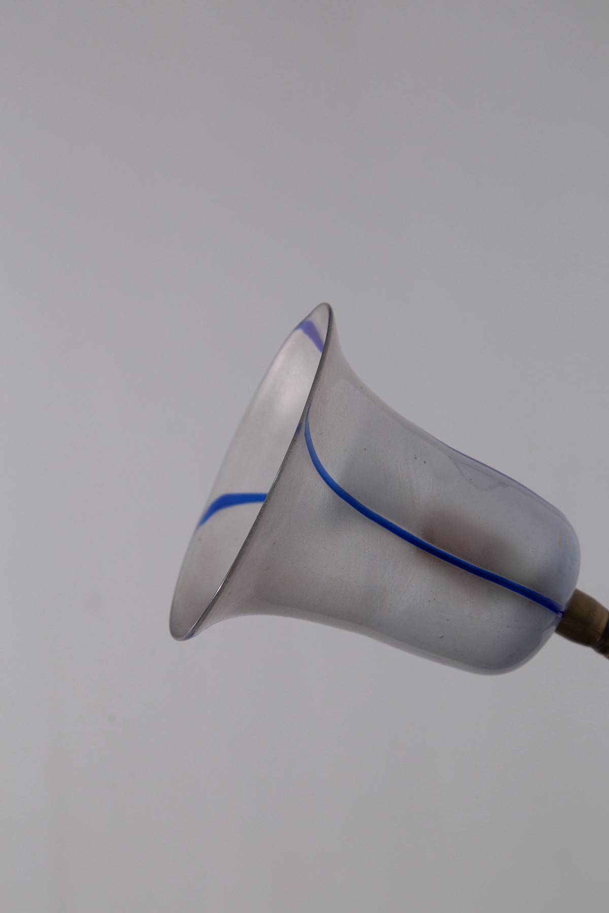Lampada da tavolo snodabile anni 90, in ottone tubolare snodabile e vetro bianco e blu