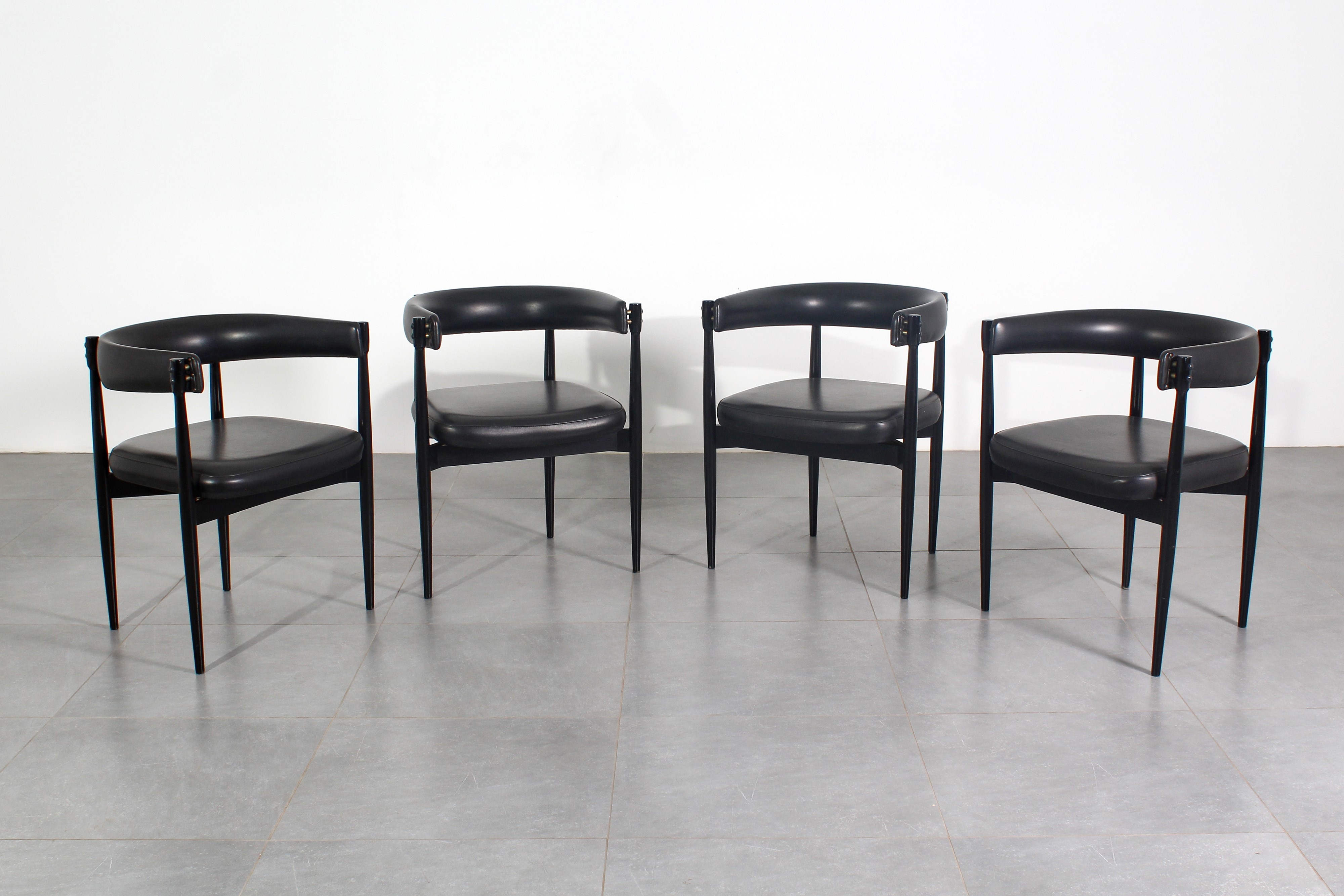 Set di 4 poltroncine di Flam Sansoni per A. Dal Vera e Figli, 1959. Struttura in legno verniciato nero opaco, seduta e schienale in pelle sintetica nera.