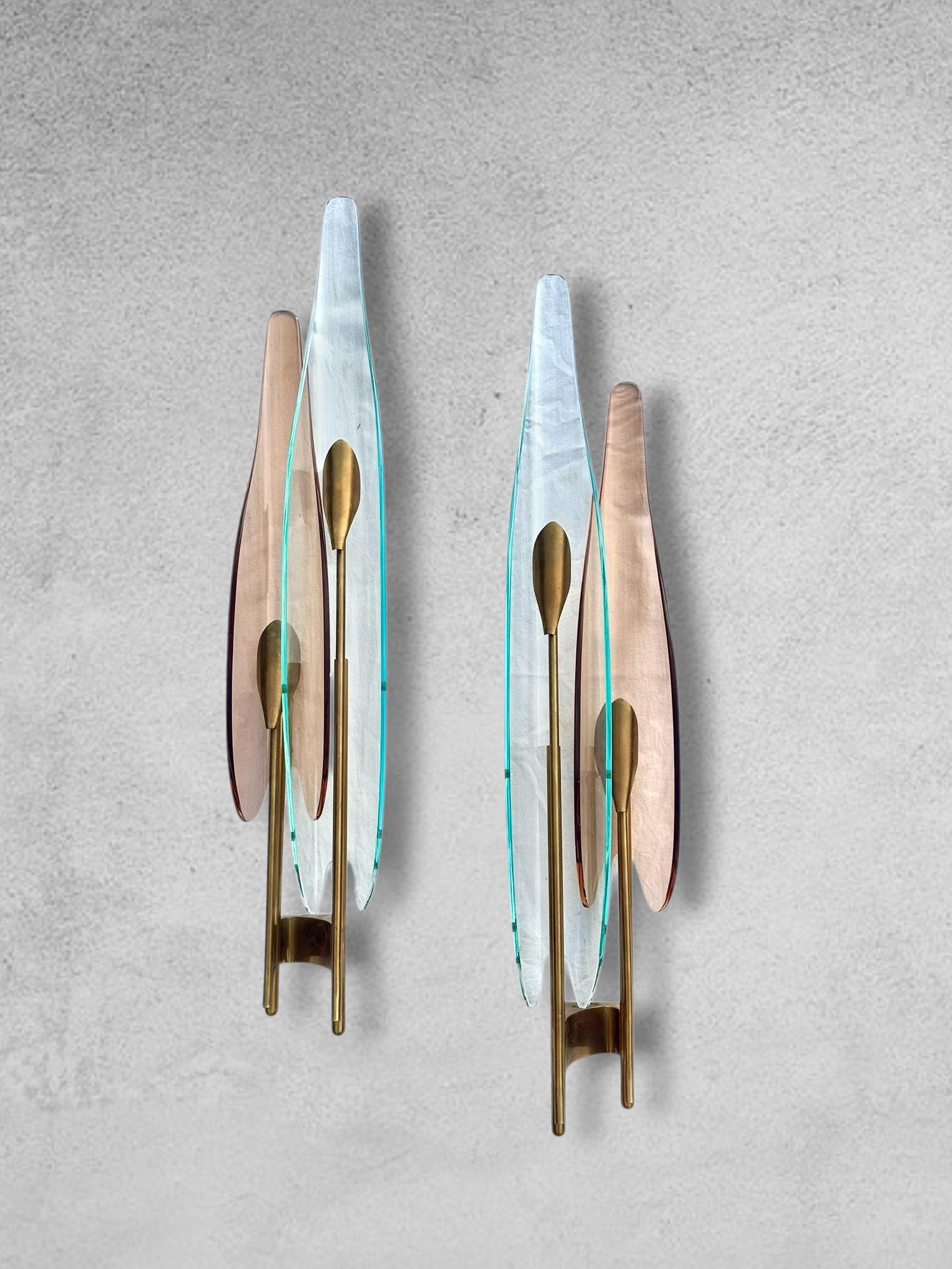 Due applique mod. 1461 Dahlia con struttura in ottone, cristalli in vetro trasparente e rosa sagomati. Prod. Fontana Arte Anni '50 Bibliografia