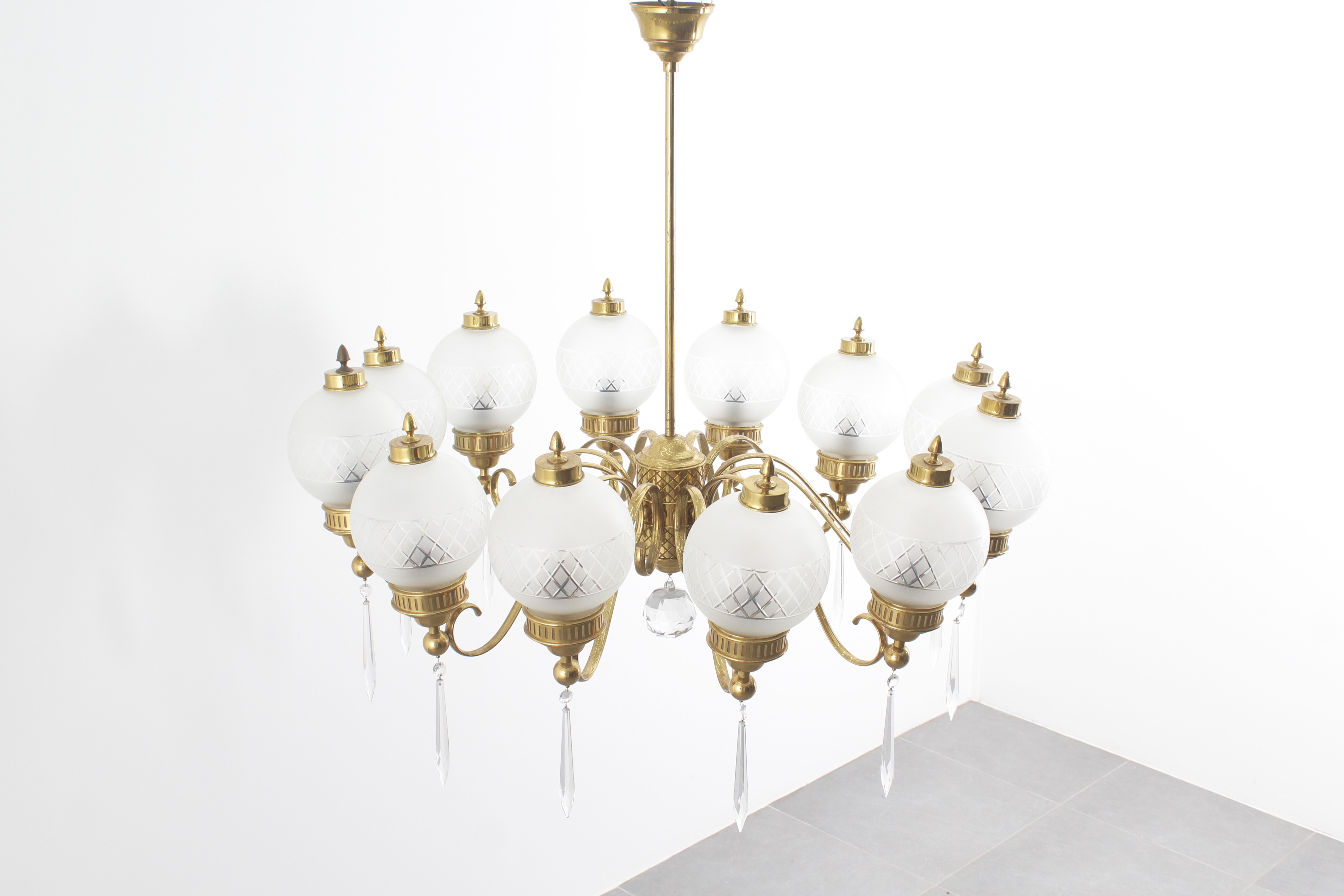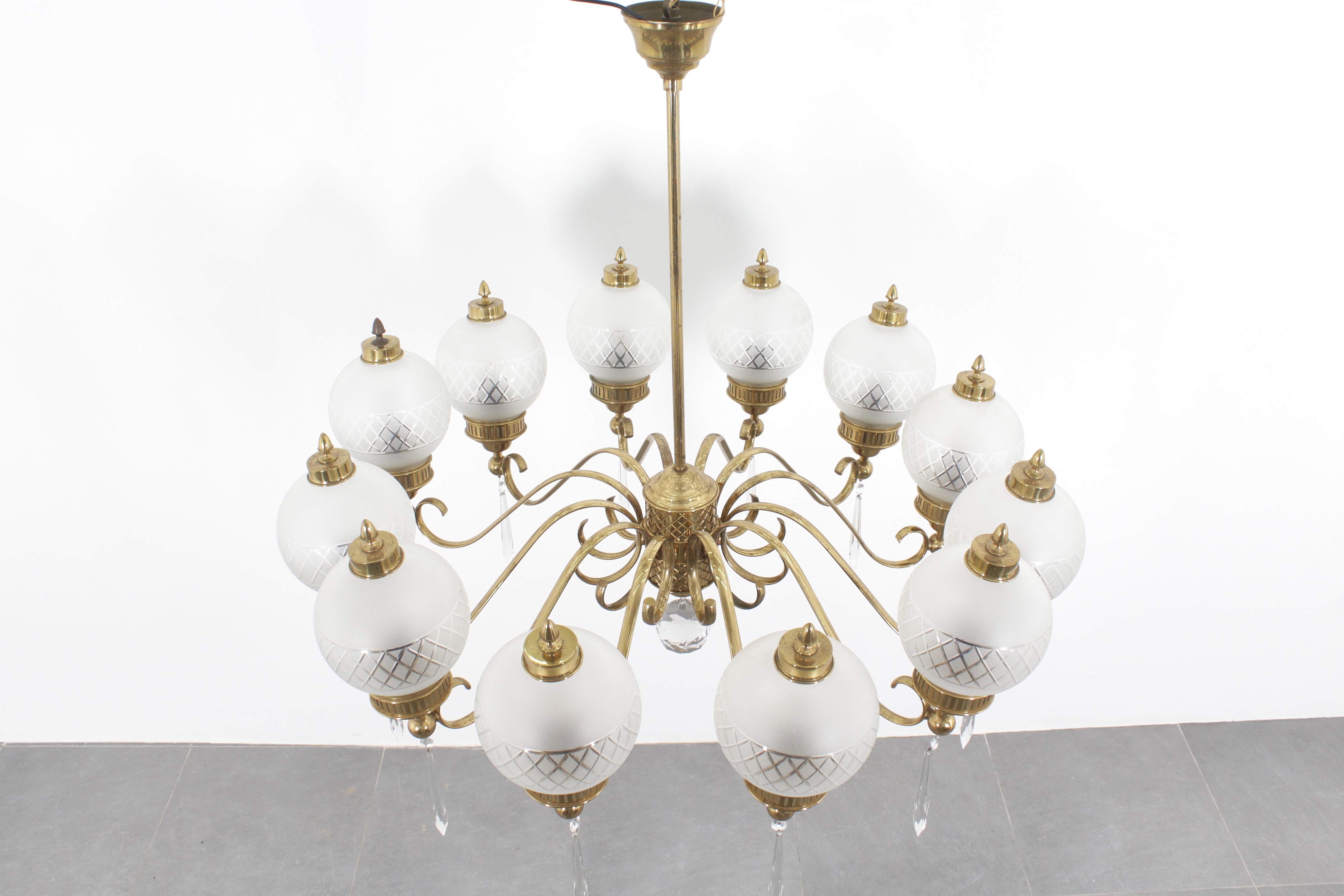 Lampadario a 12 bracci in ottone, con diffosori a globo in vetro satinato e pendenti in cristallo sfaccettato. Di Angelo Lelii per Arteluce, anni '50.