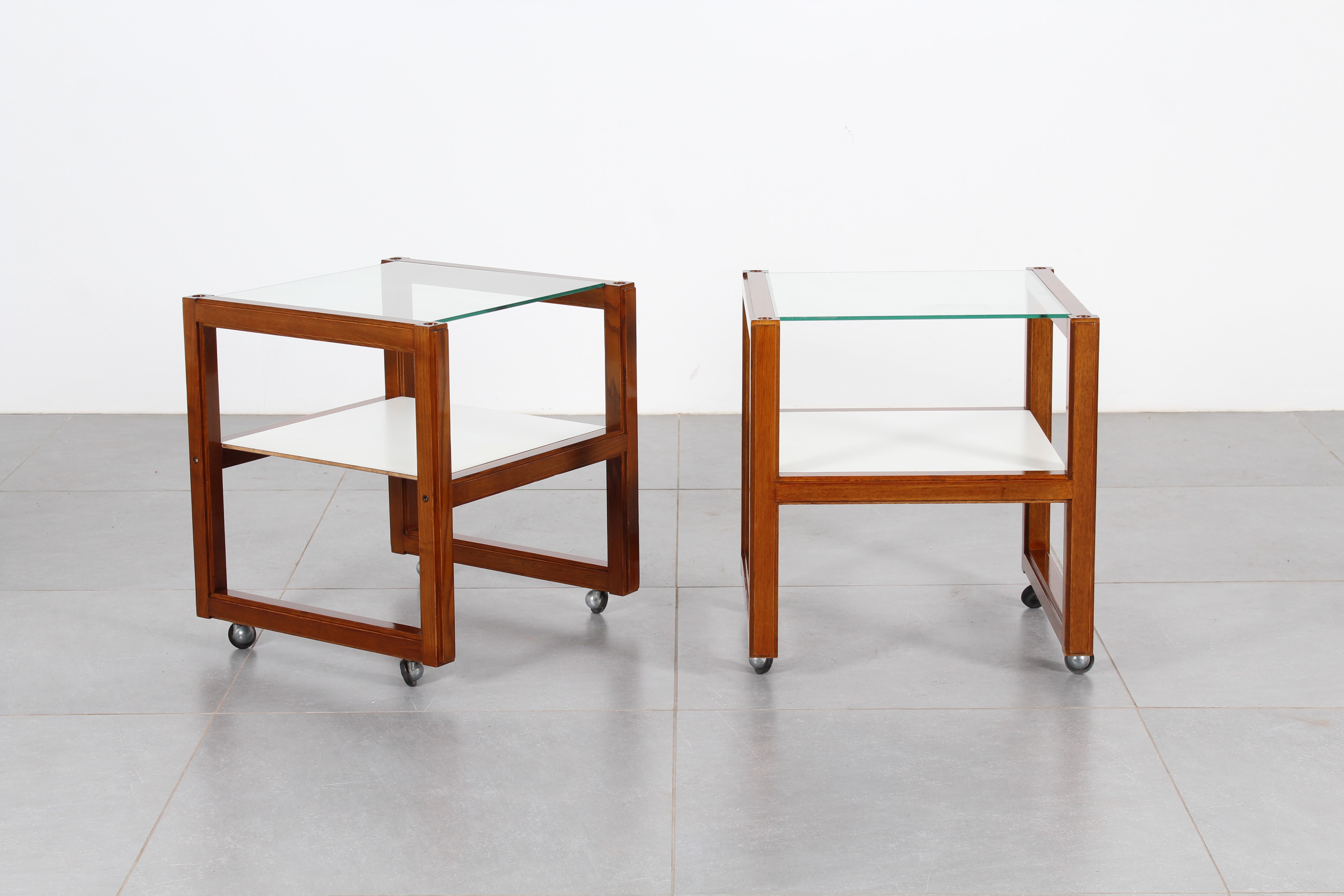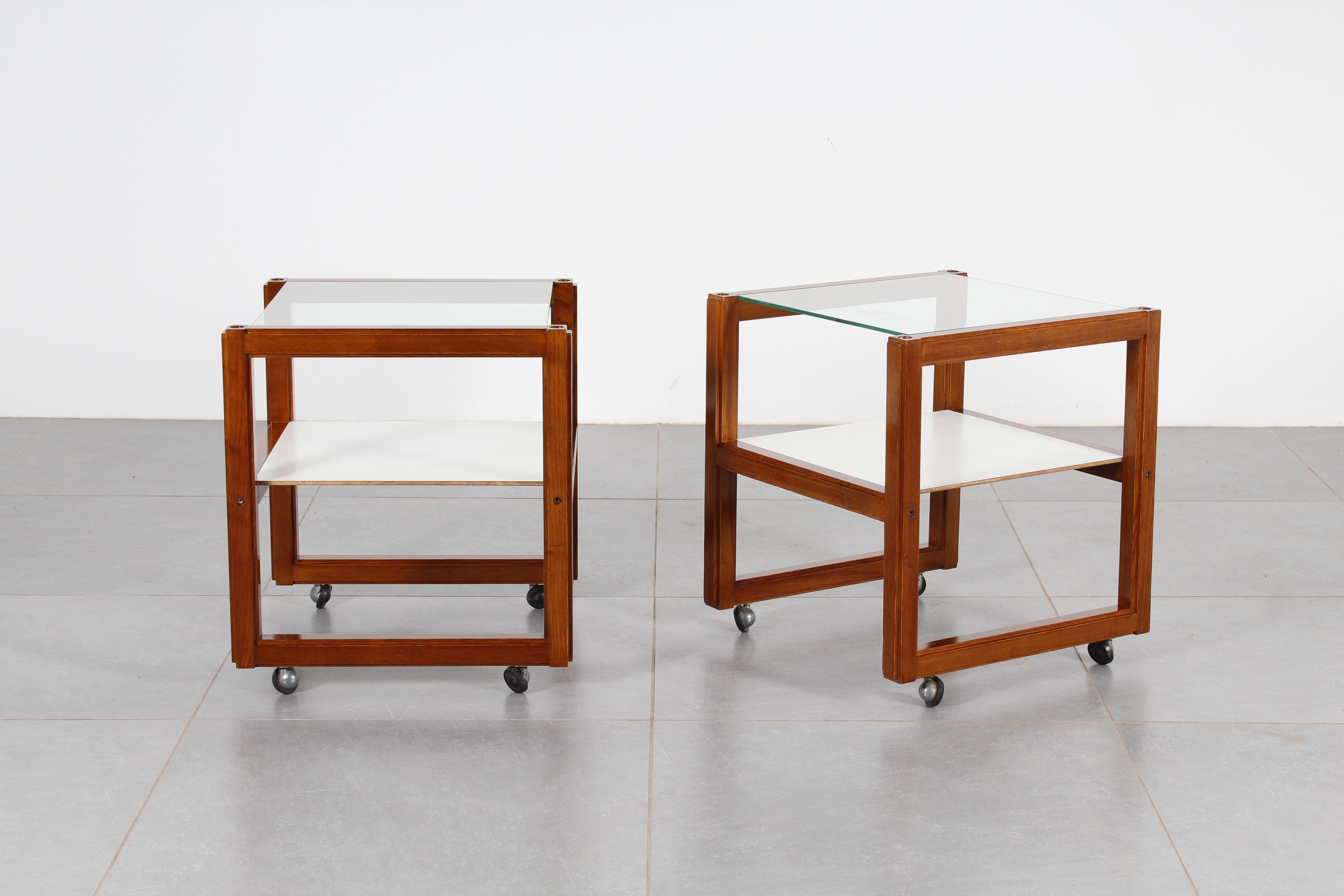Coppia di tavolini con ruote, in legno con ripiano in formica e vetro temperato. Produzione italiana degli anni '60.