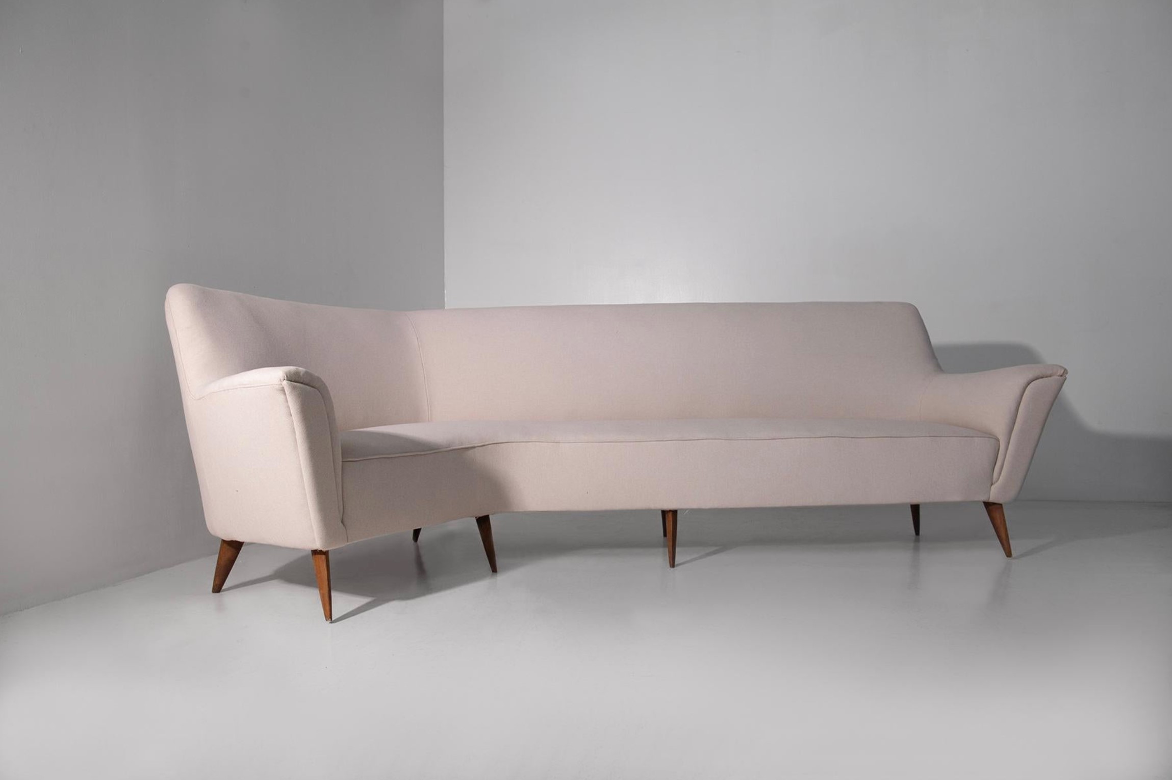 Grande divano ad angolo di manifattura italiana in stile Gio Ponti anni 50. Piedini in legno e rifoderato in cotono bianco