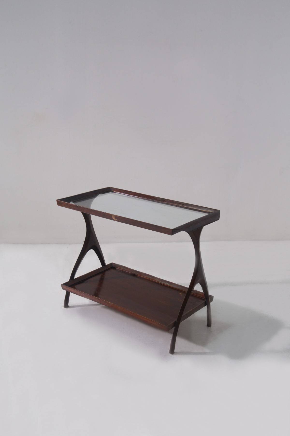 Tavolino bar anni 50 a due ripiano con piano d'appoggio in vetro.
