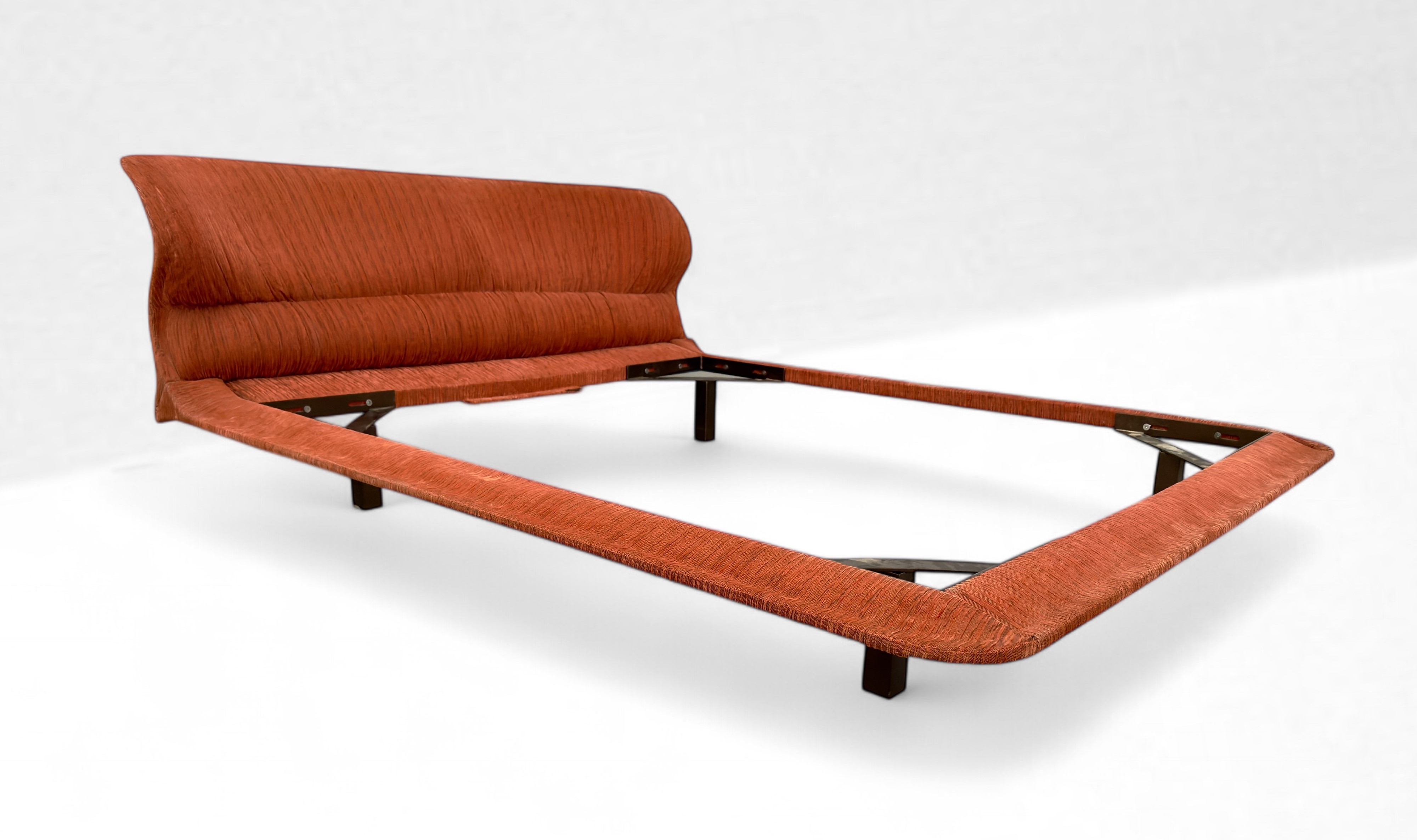 Letto matrimoniale modello vela, struttura in metallo con imbottitura e rivestimento in tessuto, elementi di assemblaggio in ferro verniciato. Designer Giovanni Offredi. Produzione Saporiti, Italia 1980 ca.
