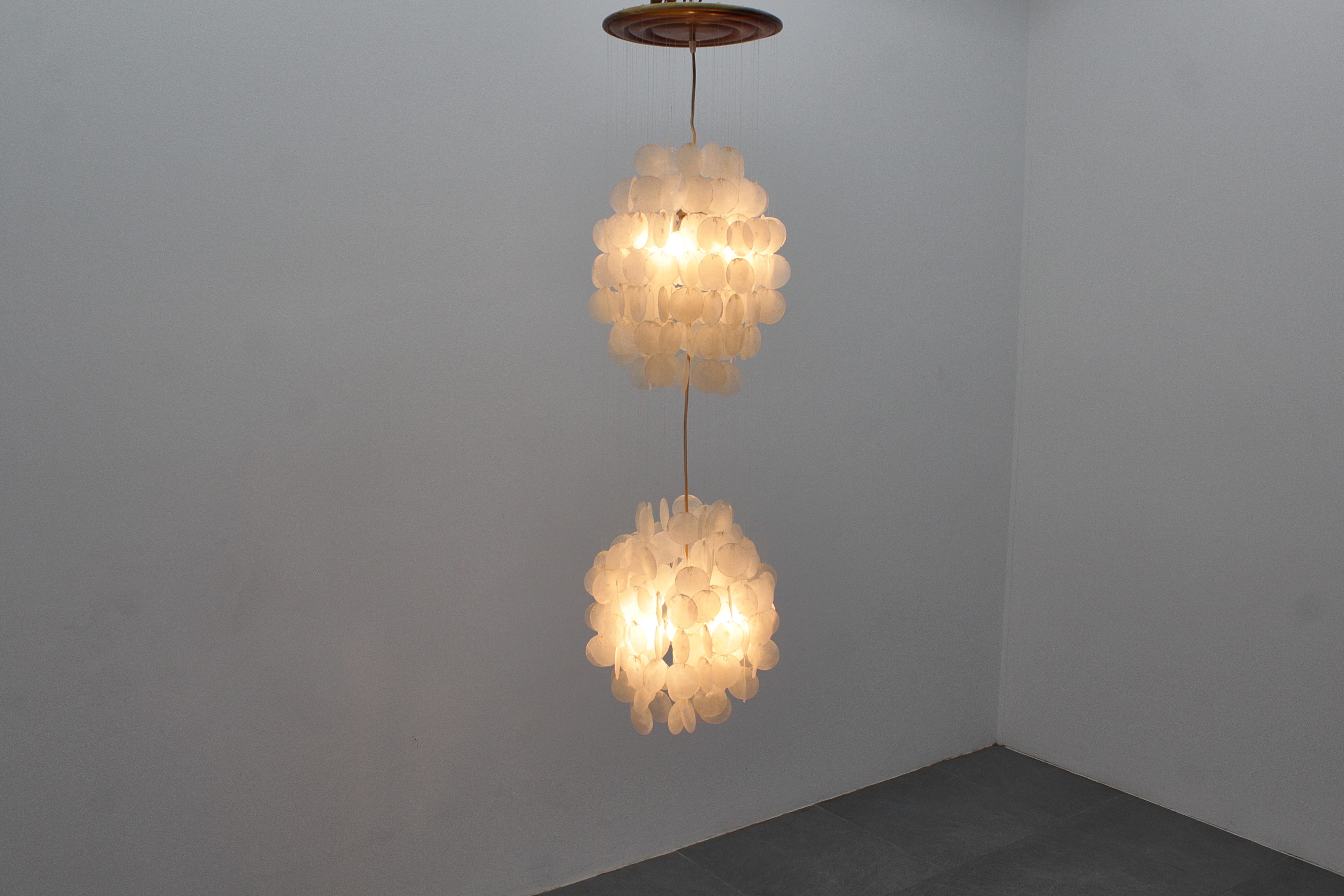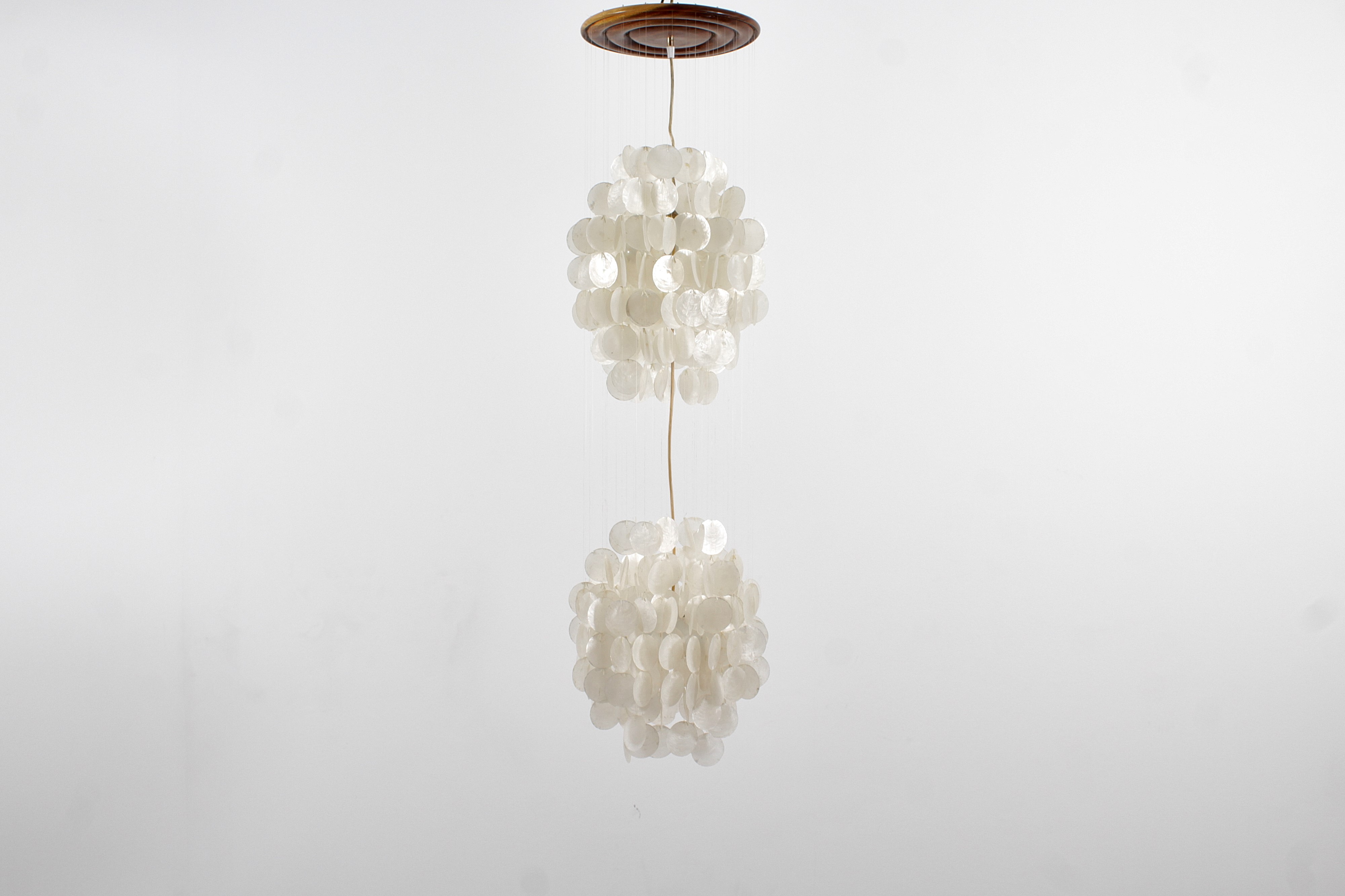Lampada a sospensione in madreperla, legno, metallo, nylon. Di Verner Panton, Produzione J. Luber Ag, anni '60.