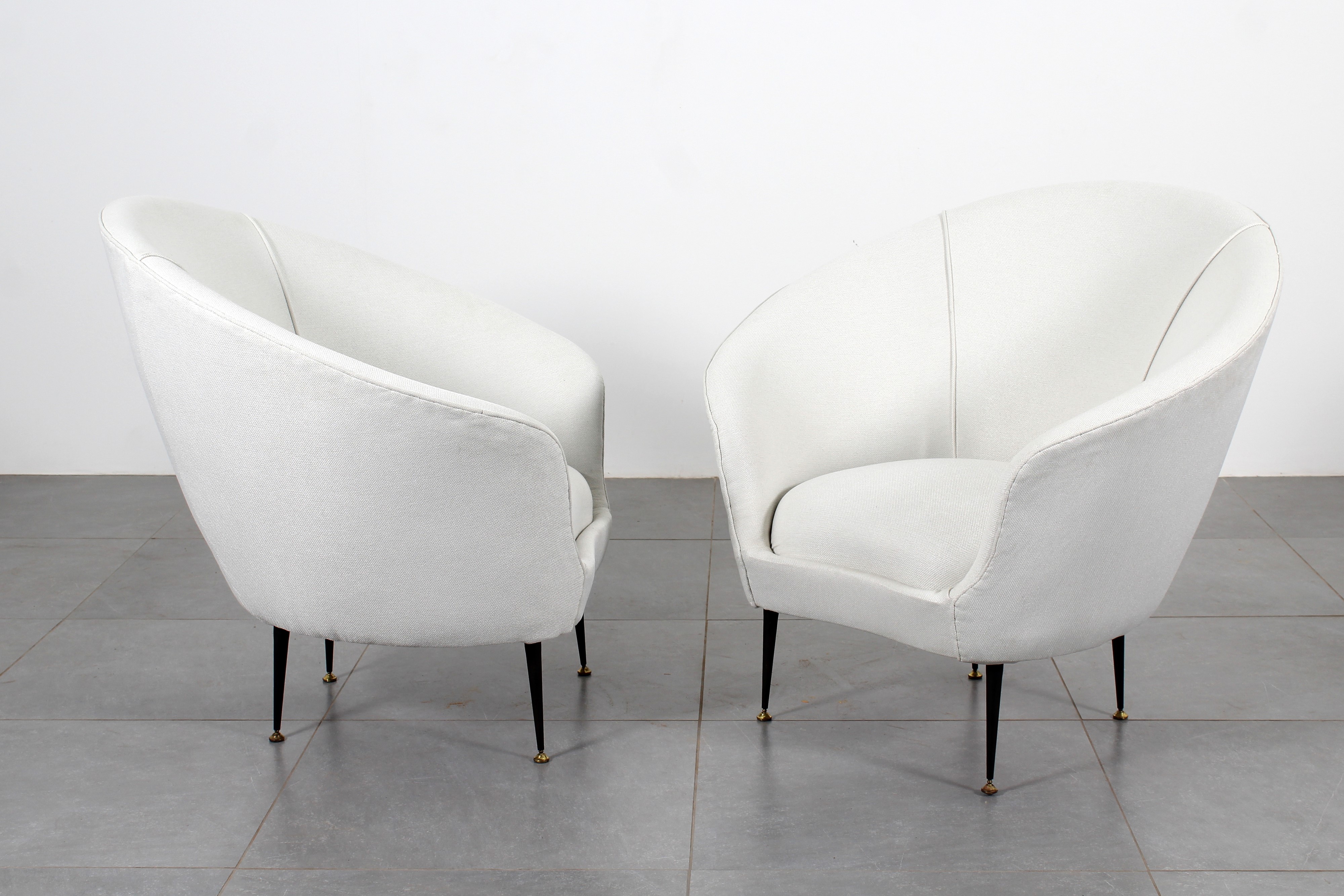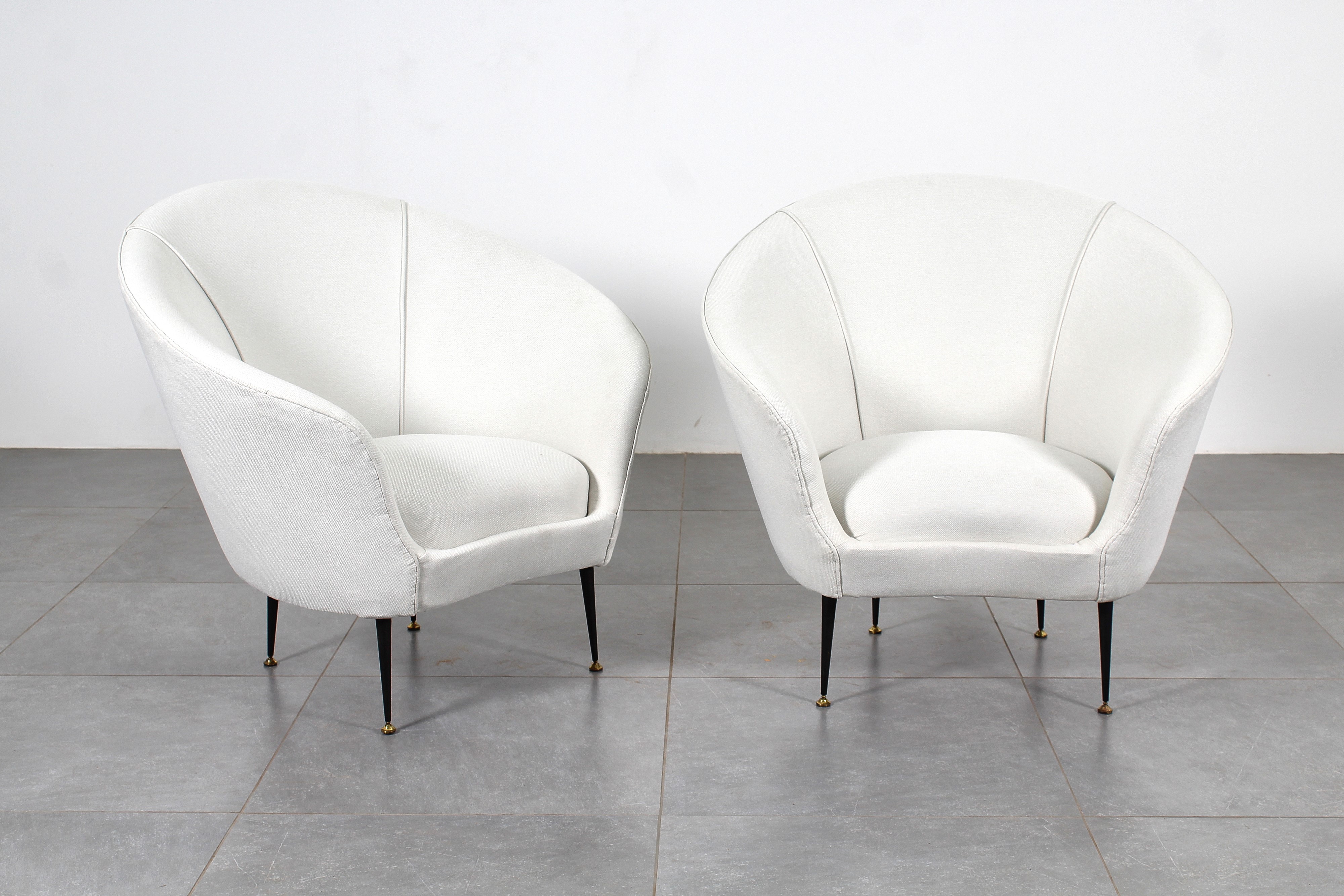 Coppia di poltrone bombate a uovo, in stoffa bianca, piedi in metallo e finiture in ottone. Attribuibile a Ico Parisi, Italia anni '50.