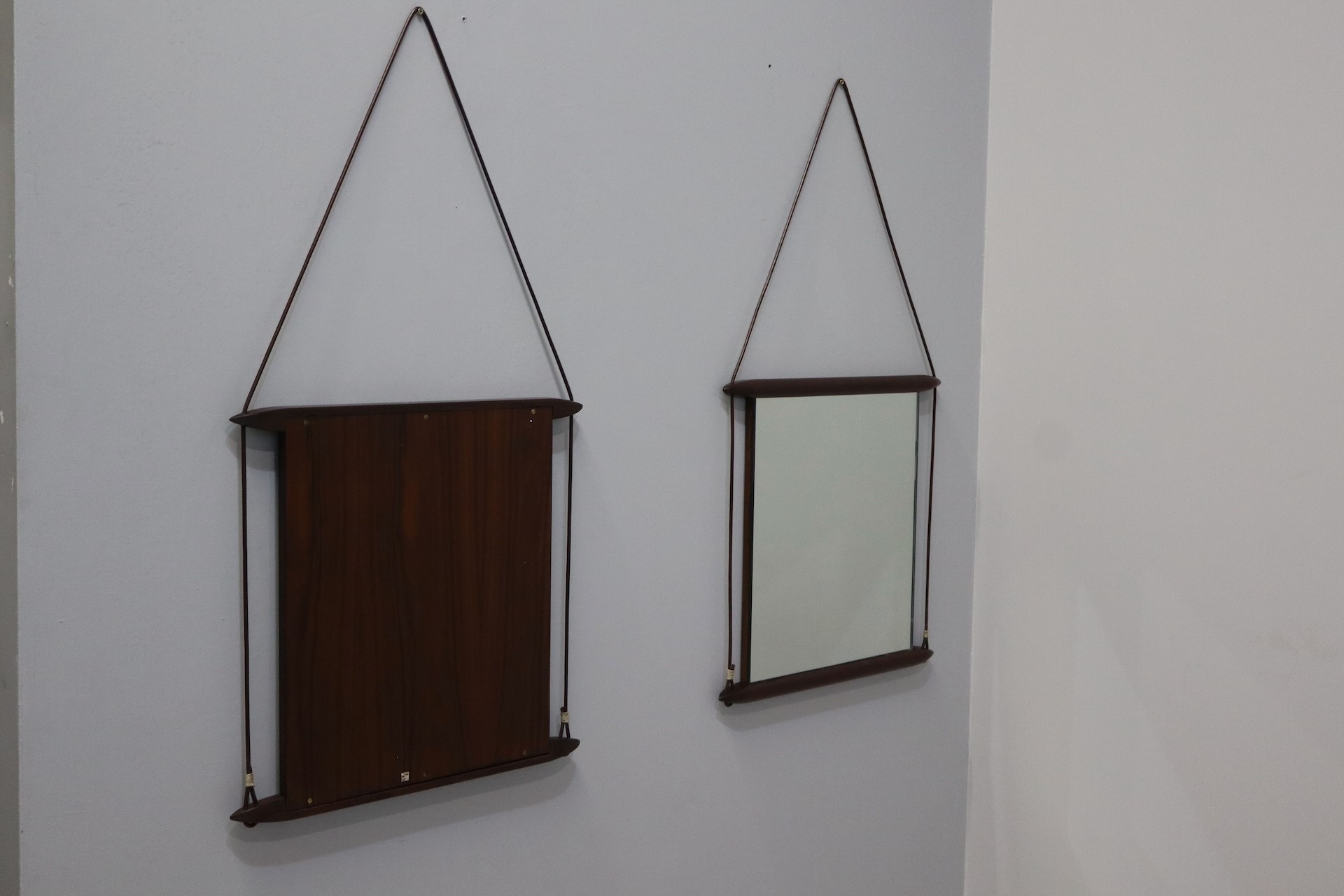 Coppia di specchi da parete del XX secolo di Ico Parisi per MIM in legno e nastro di pelle degli anni '50