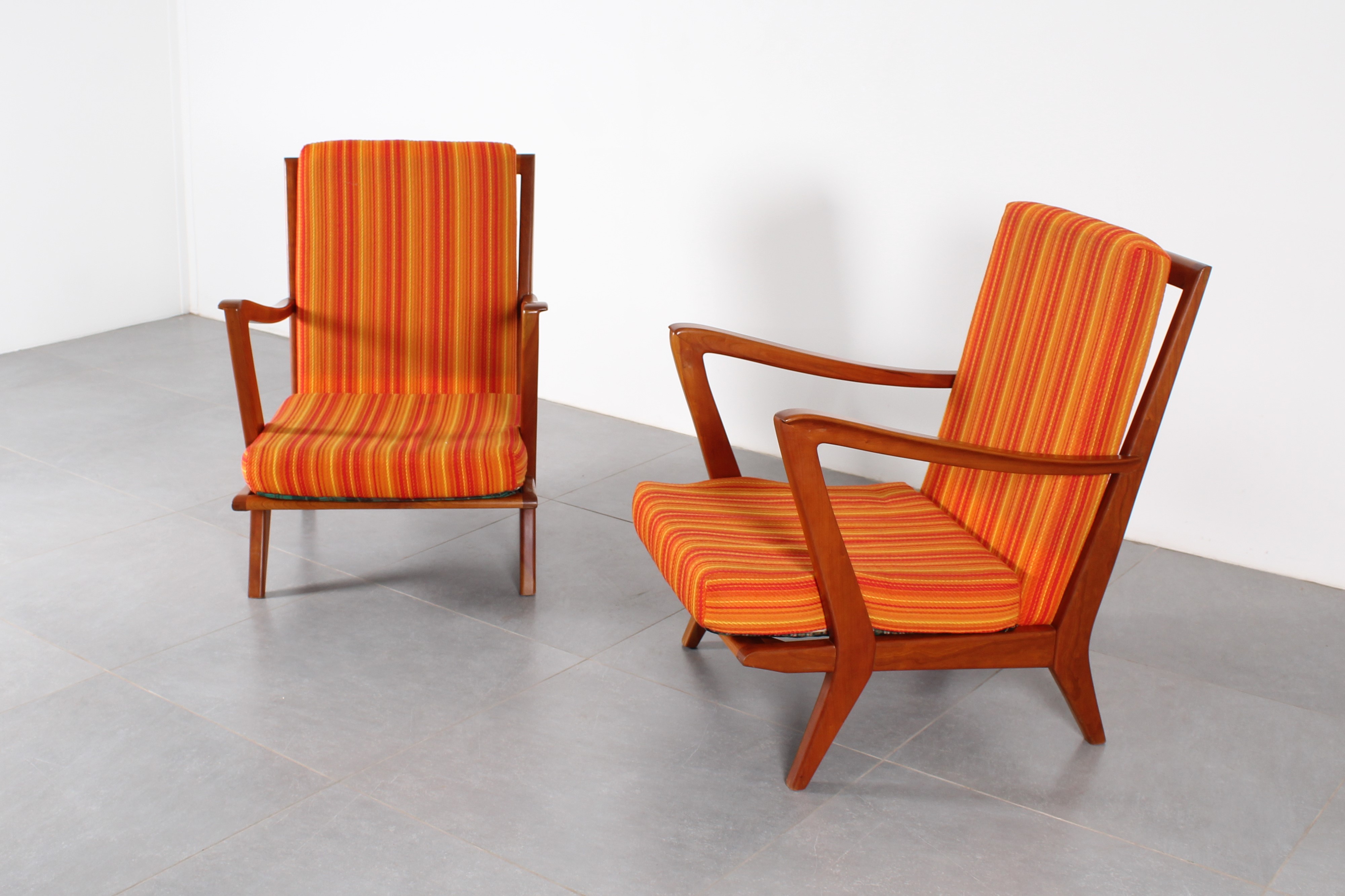 Coppia di poltrone mod. 516 di Giò Ponti per Cassina, anni '50. Struttura in legno sagomato, metallo e fodera a righe nelle tonalità dell'arancio.