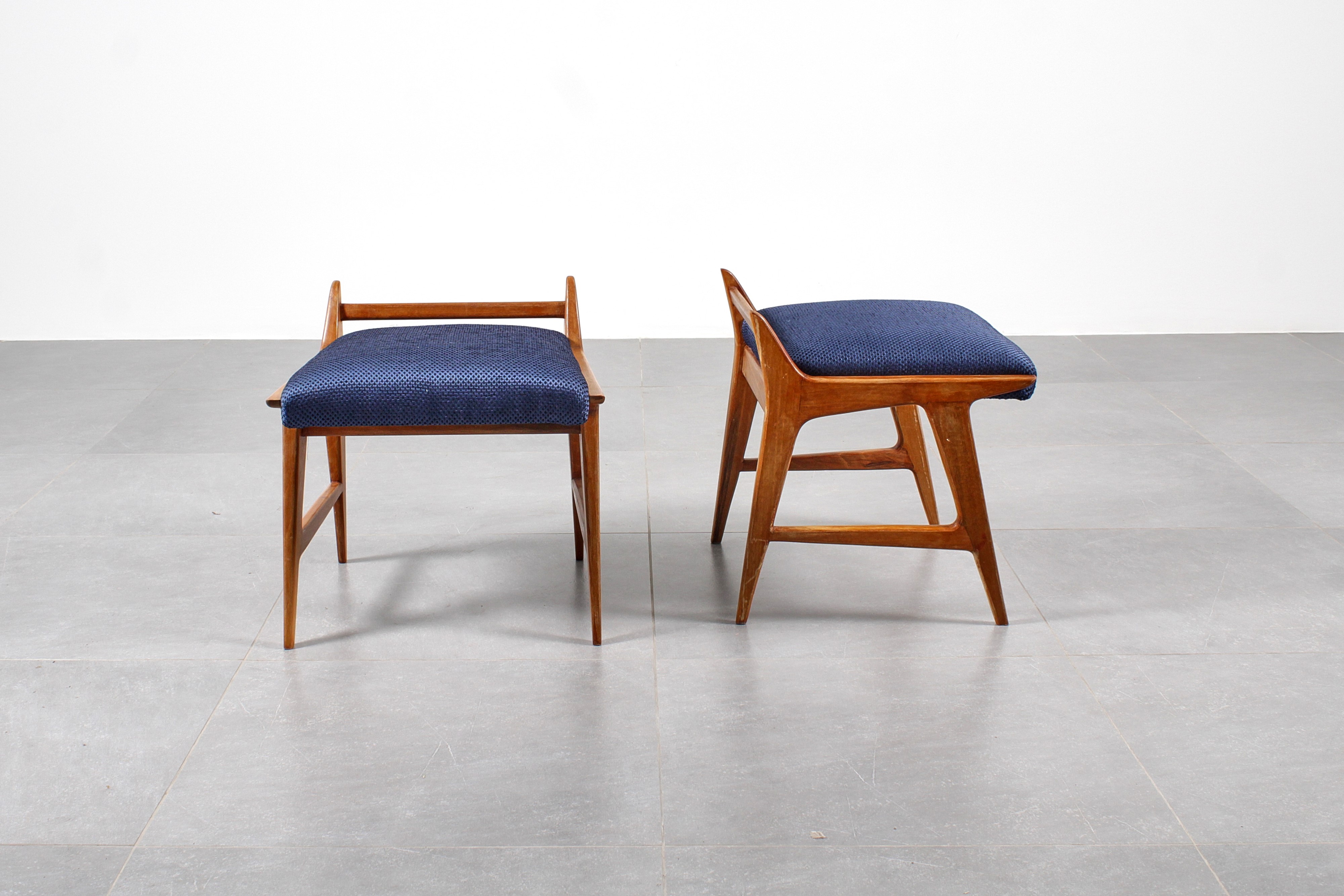 Coppia di pouf in legno chiaro e tessuto blu, attribuiti a Giò Ponti, Italia anni '50.