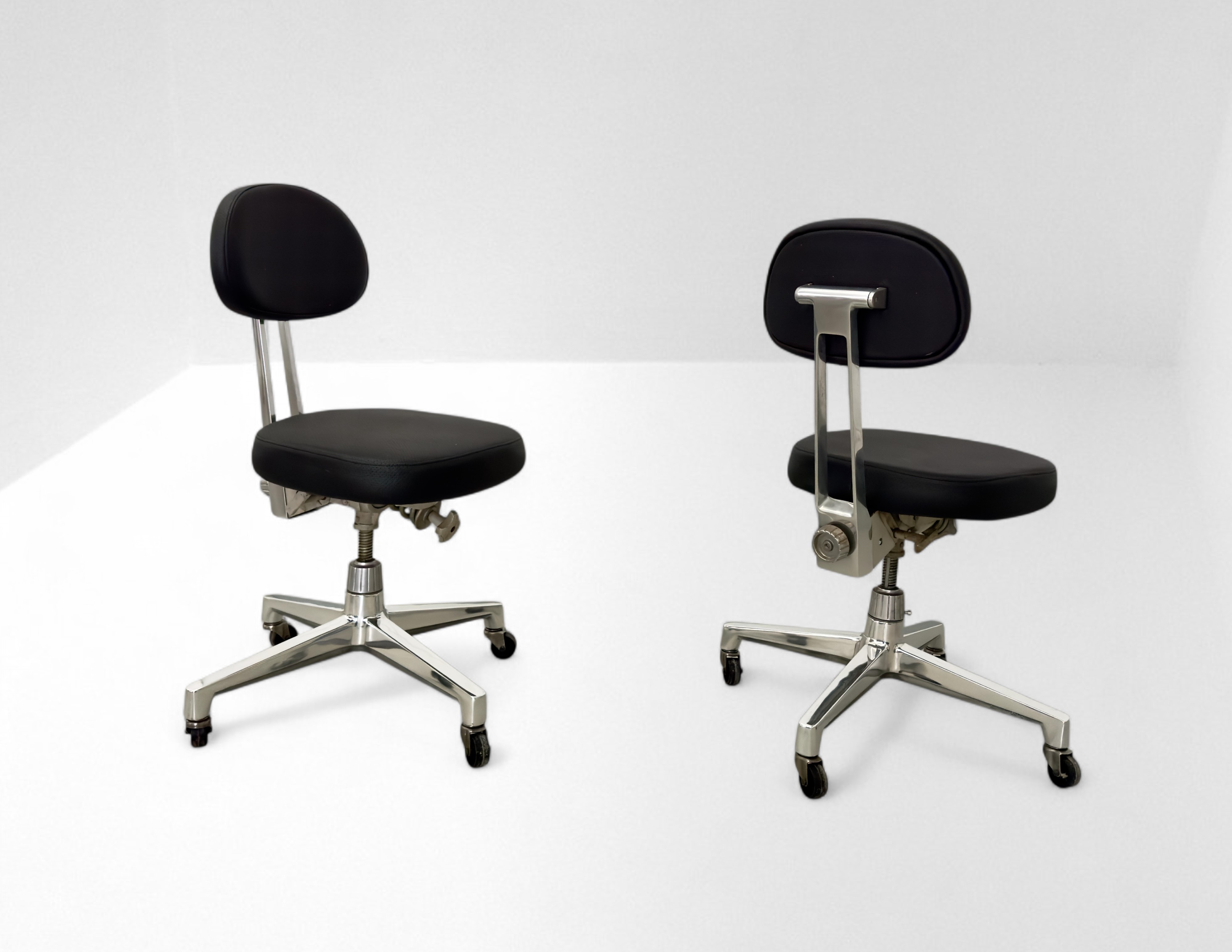 Coppia di sedie da ufficio in pelle nera e struttura in acciaio. Attribuita a Gio Ponti, Italia, anni '50