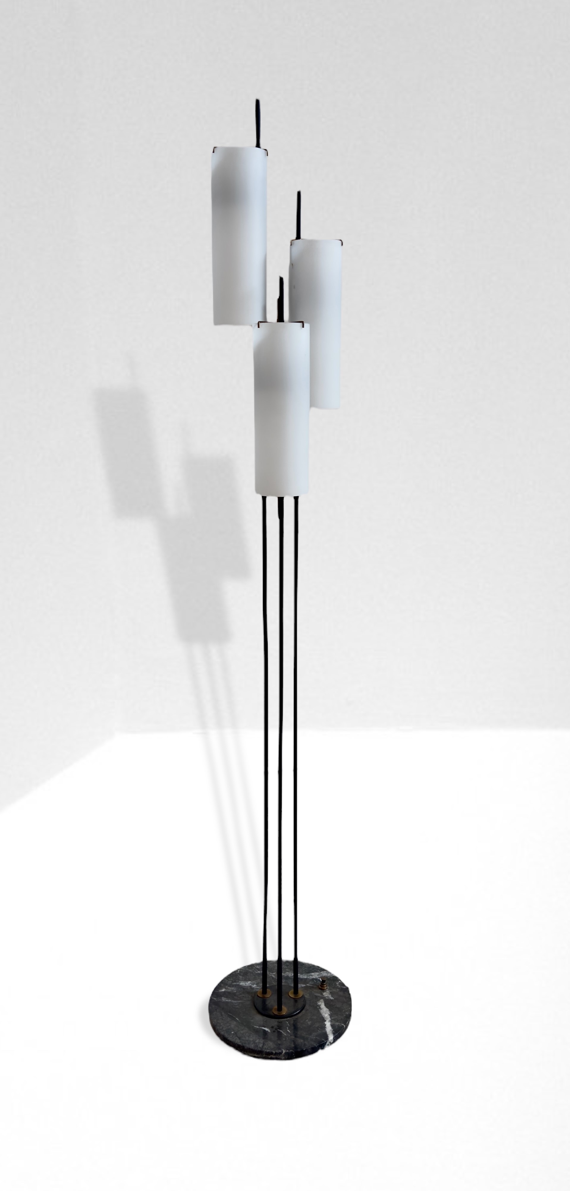 Lampada da terra con base in marmo e tre diffusori cilindrici in vetro opalino, particolari in ottone. Stilnovo, Italia Anni '50