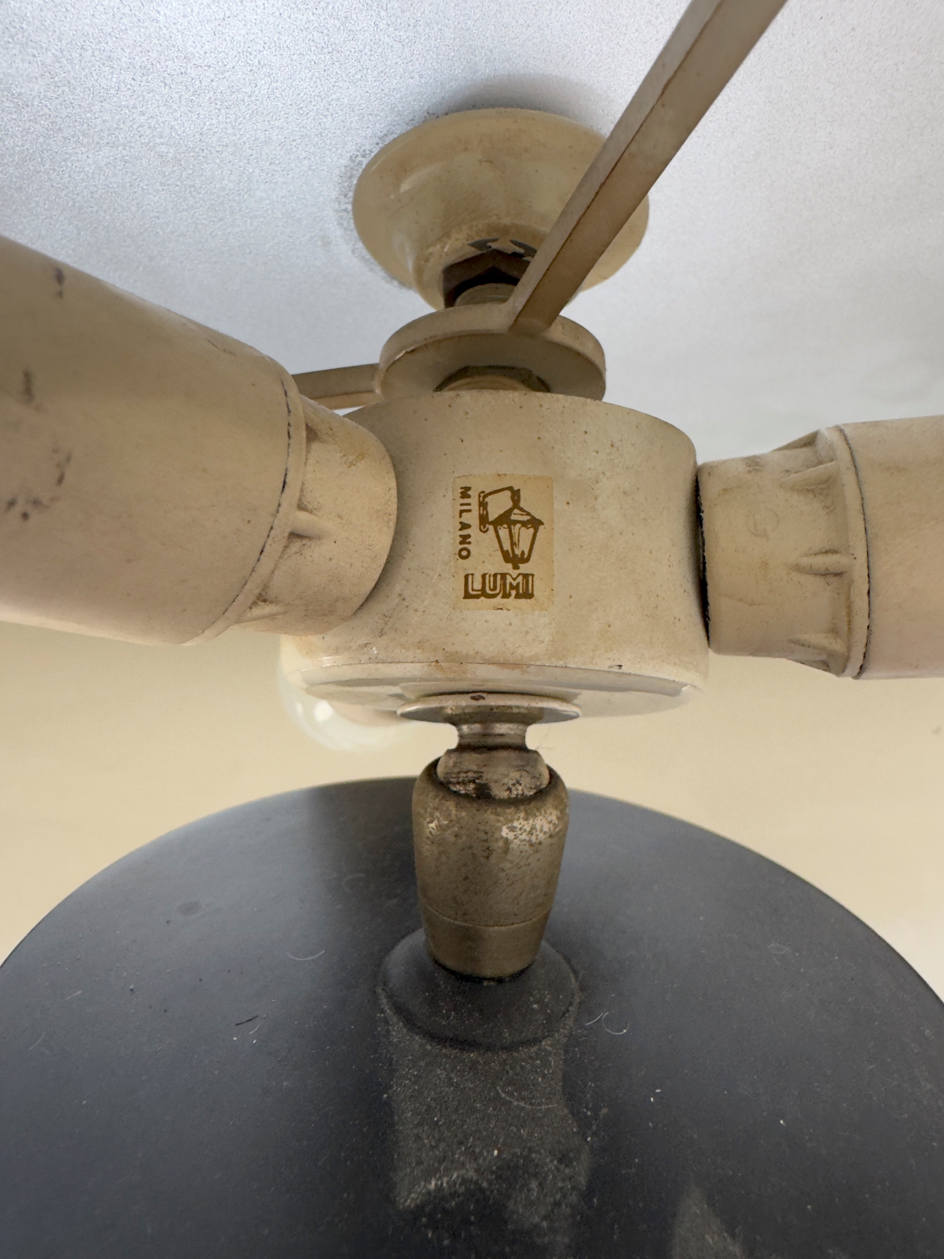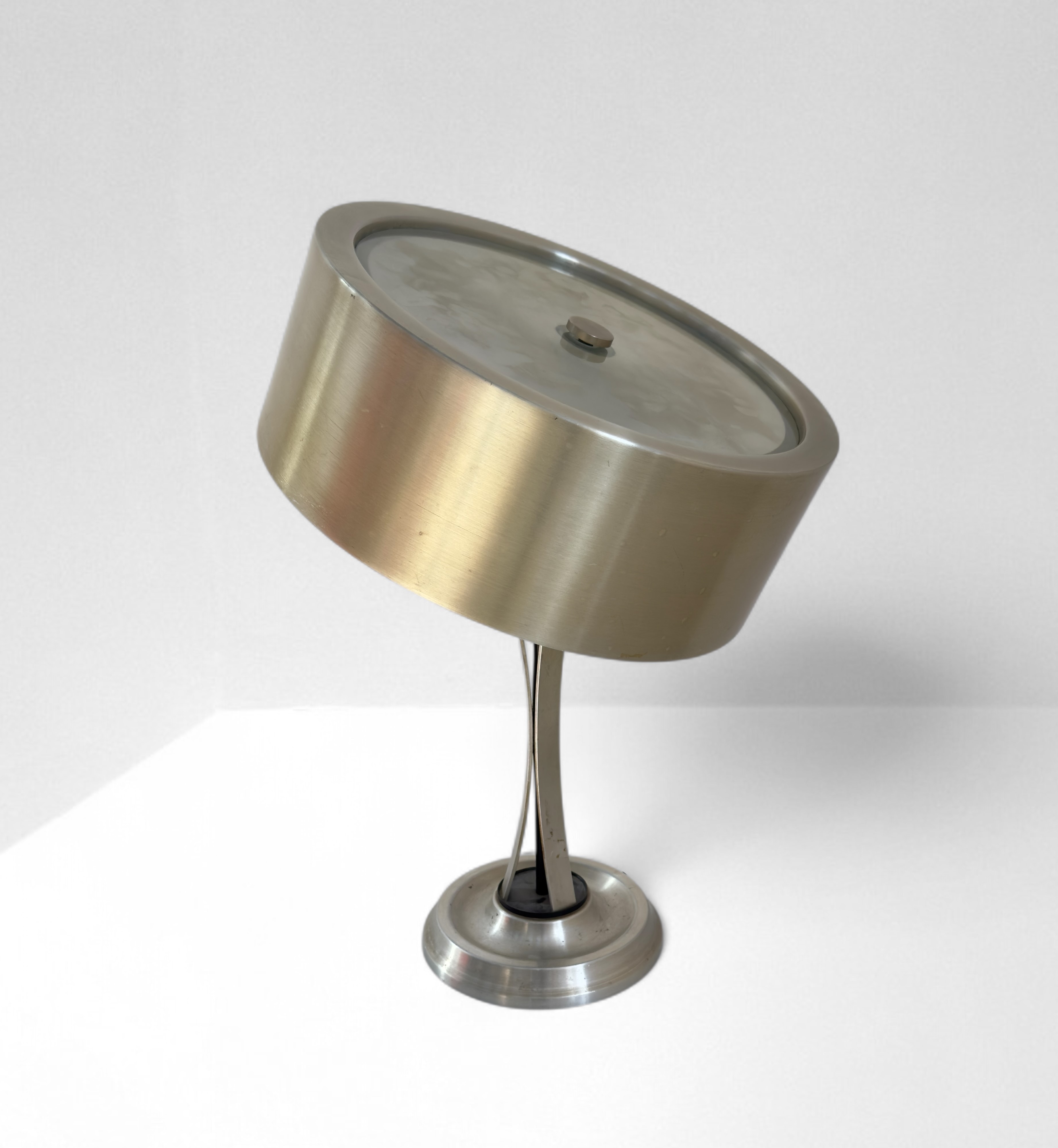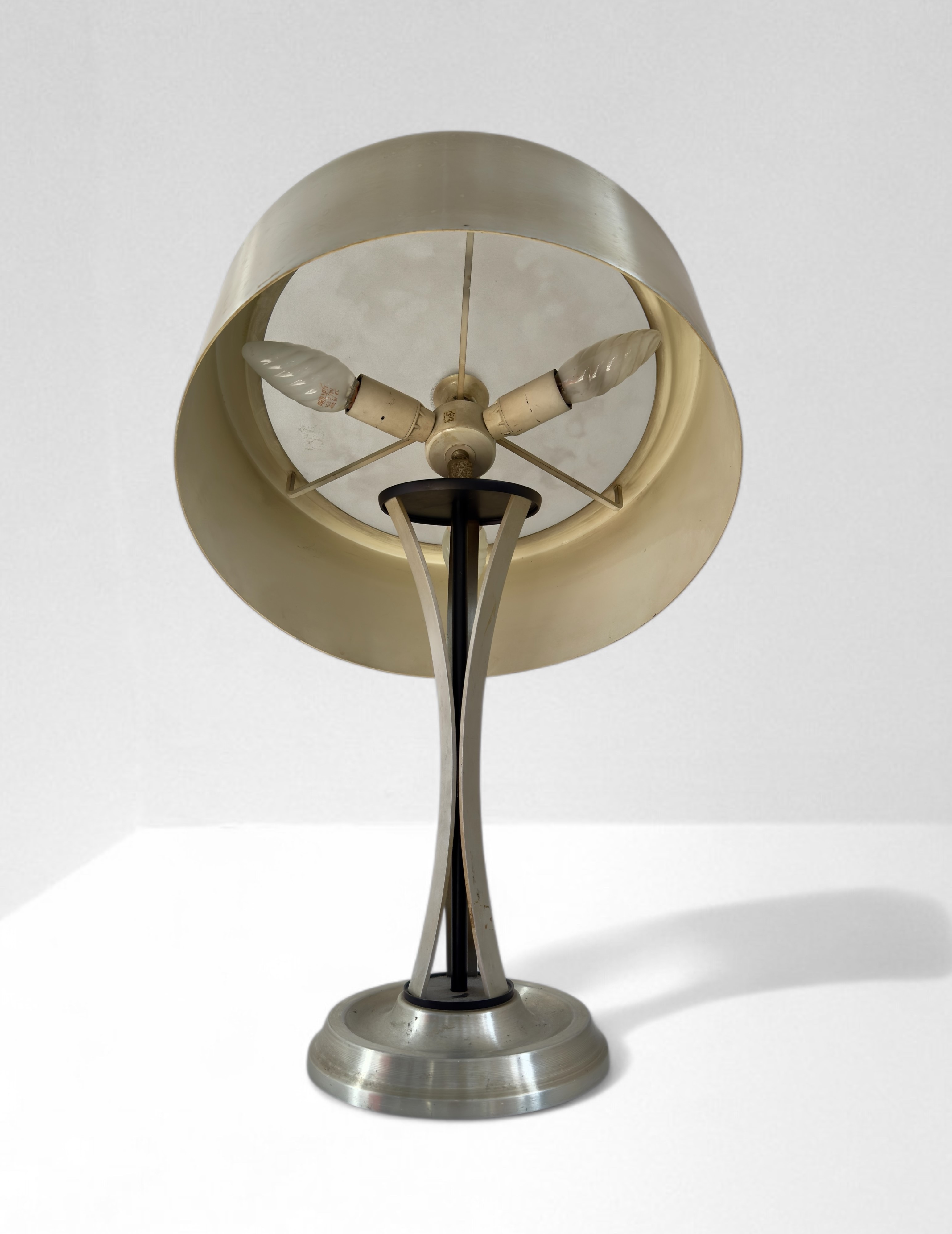 Lampada da tavolo con struttura in ottone nichelato e paralume in metallo laccato. Schermo in vetro satinato. Oscar Torlasco.
