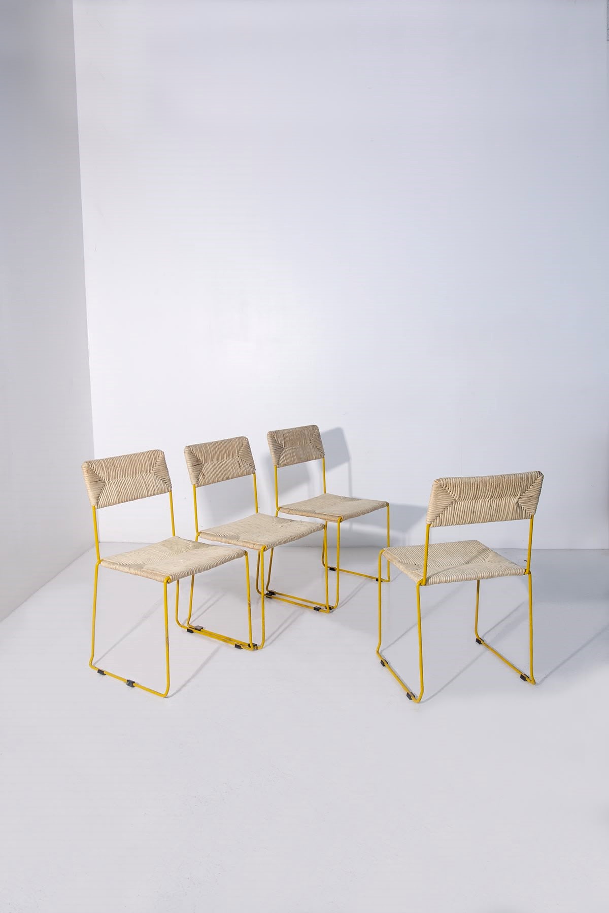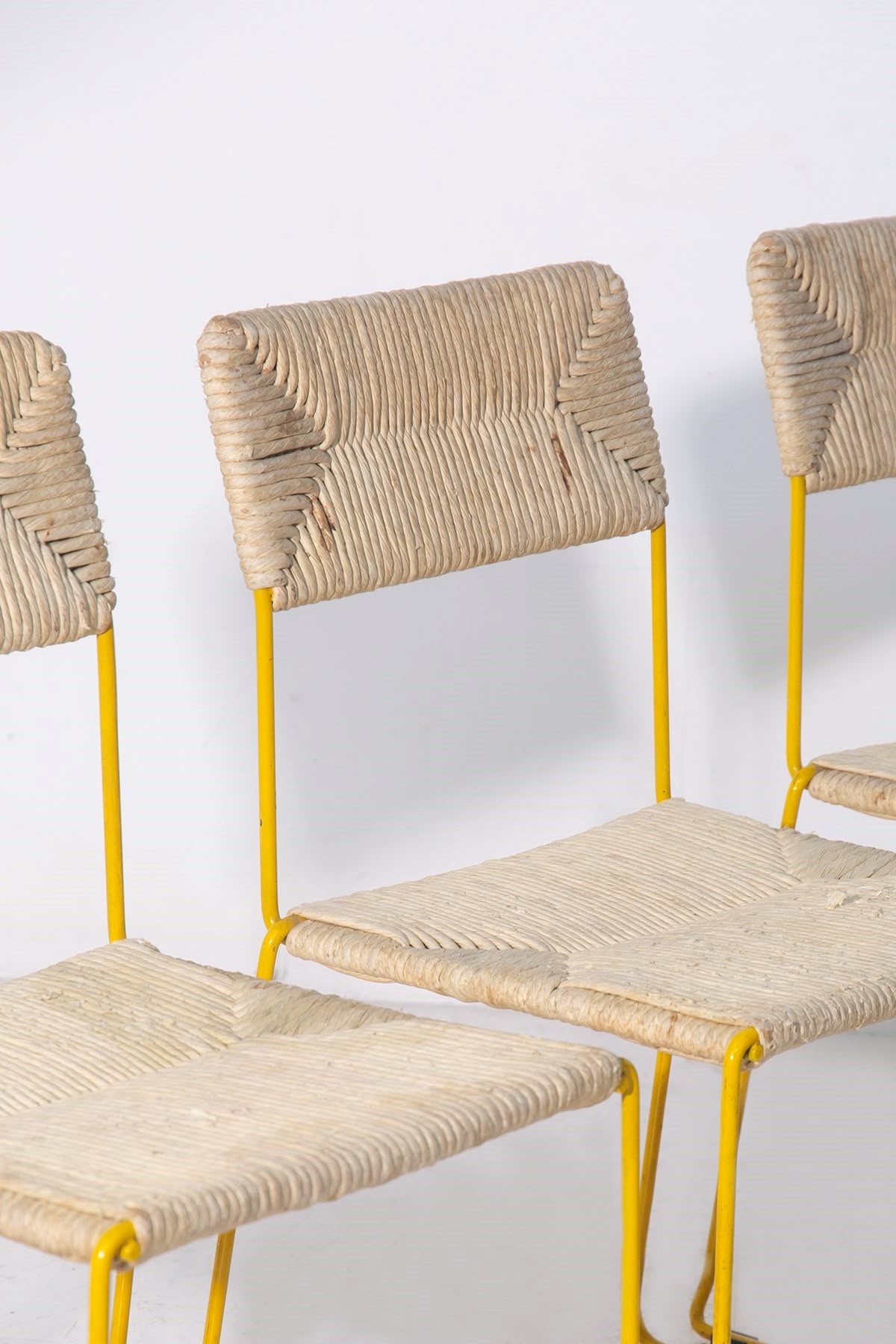 Set di 4 sedie da pranzo francesi di Pirela Atelier, realizzato negli anni '60. Struttura in tondino di metallo smaltato, seduta e schienali intrecciati con corda di canapa.