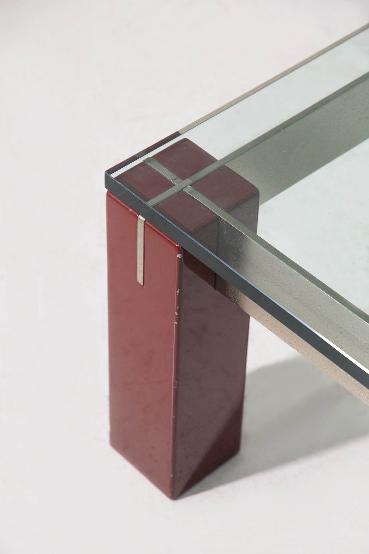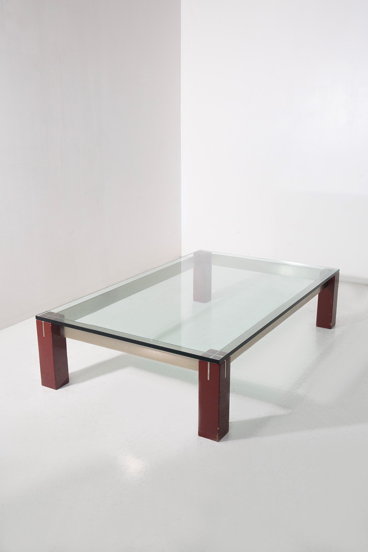 Grande tavolino d'appoggio anni 70, in legno laccato base in metallo o acciaio con ripiano in vetro spesso