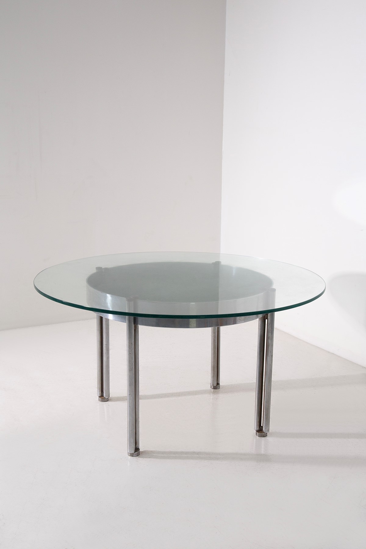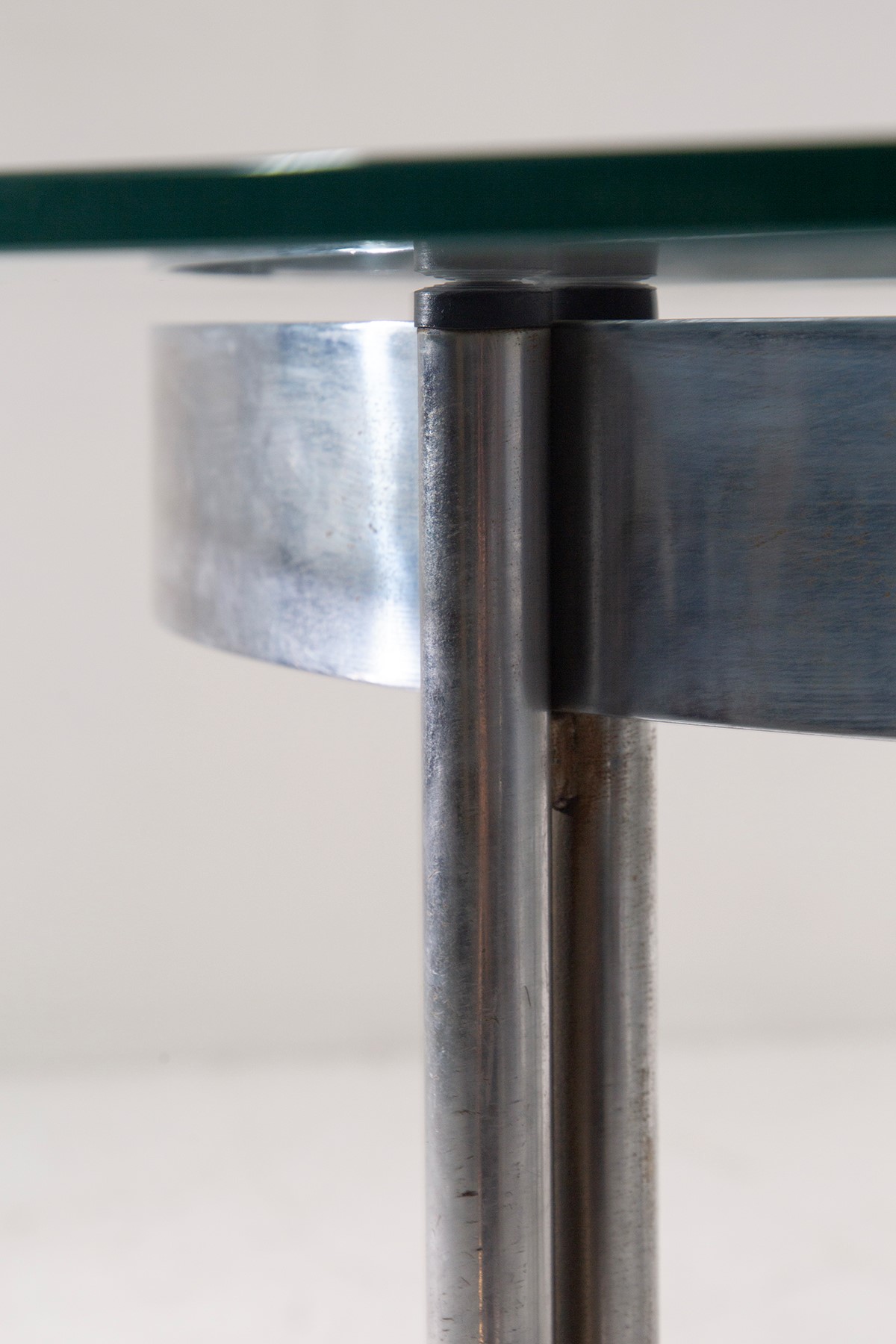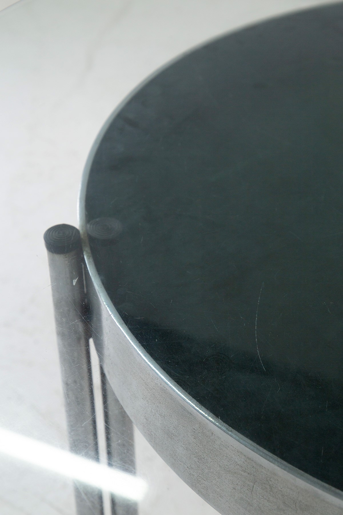 Tavolo da gioco italiano con struttura in metallo, Piano in panno verde e ripiano d'appoggio rotondo in vetro spesso dell'epoca.