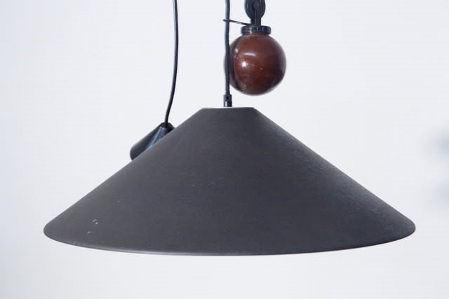 Lampada da soffitto modello “Aggregato” regolabile in altezza. Paralumi in metallo grigio acciaio a forma di cono, regolabili in altezza con contrappeso a paranco. Prodotta negli anni ’70 da Artemide su progetto di Enzo Mari.