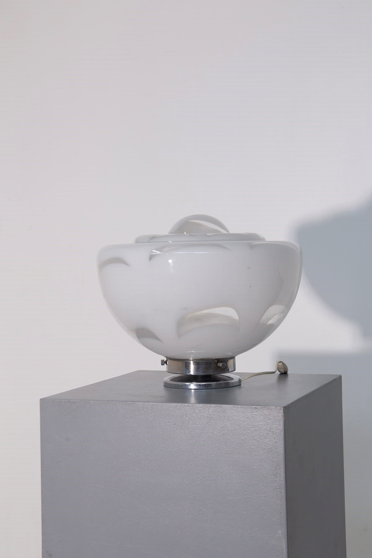 Lampada da tavolo in vetro opalino bianco con base cromata. Carlo Nason per Mazzega, Italia. Anni '70.