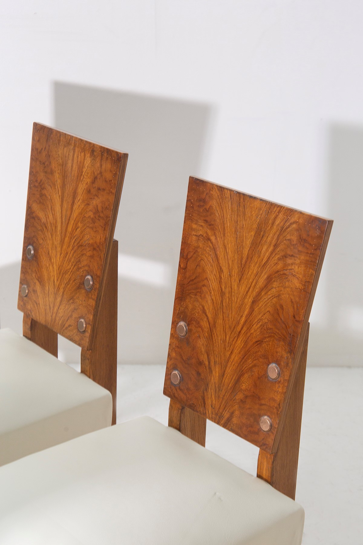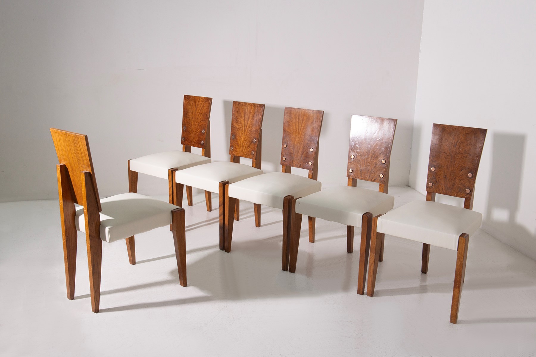Set di sei sedie di  Andre' Sornay anni 40, con seduta in pelle bianca.