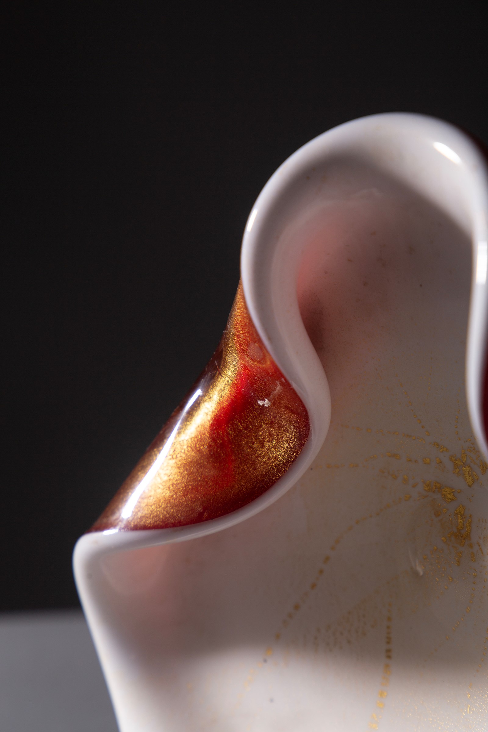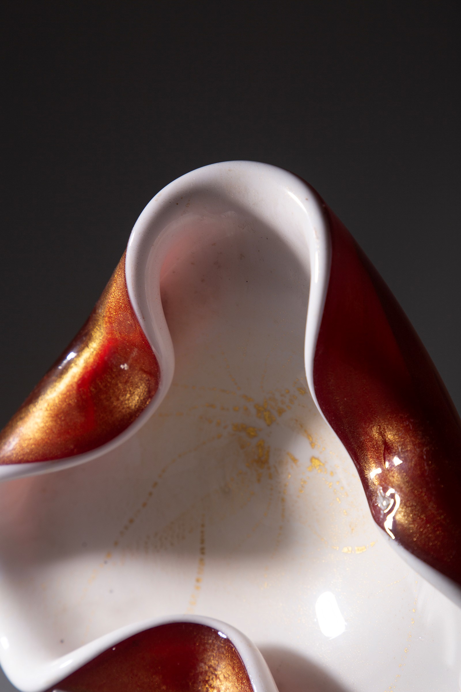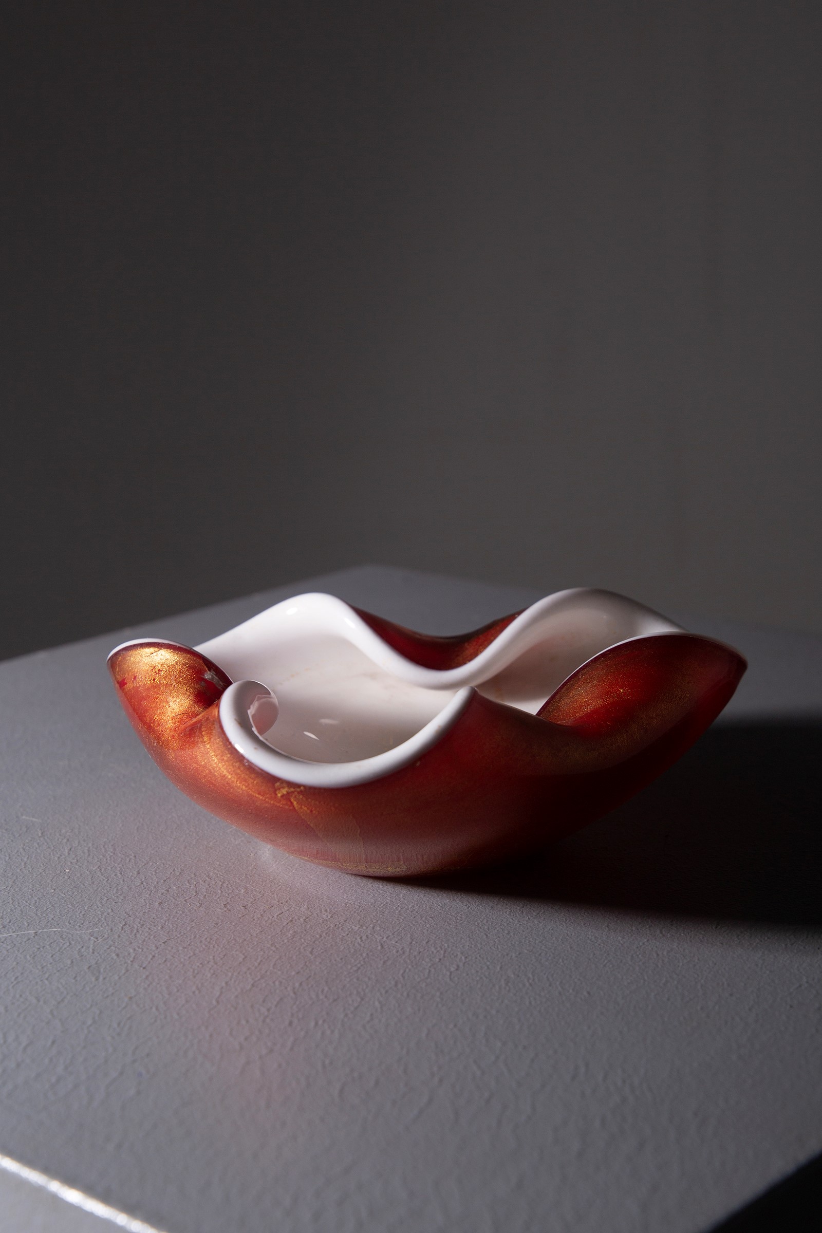 Ciotola decorativa in vetro artistico italiano soffiato a mano di Murano, di colore arancione su bianco e con macchie a bollicine dorate. Attribuito a Alfredo Barbini, circa 1950-1960.