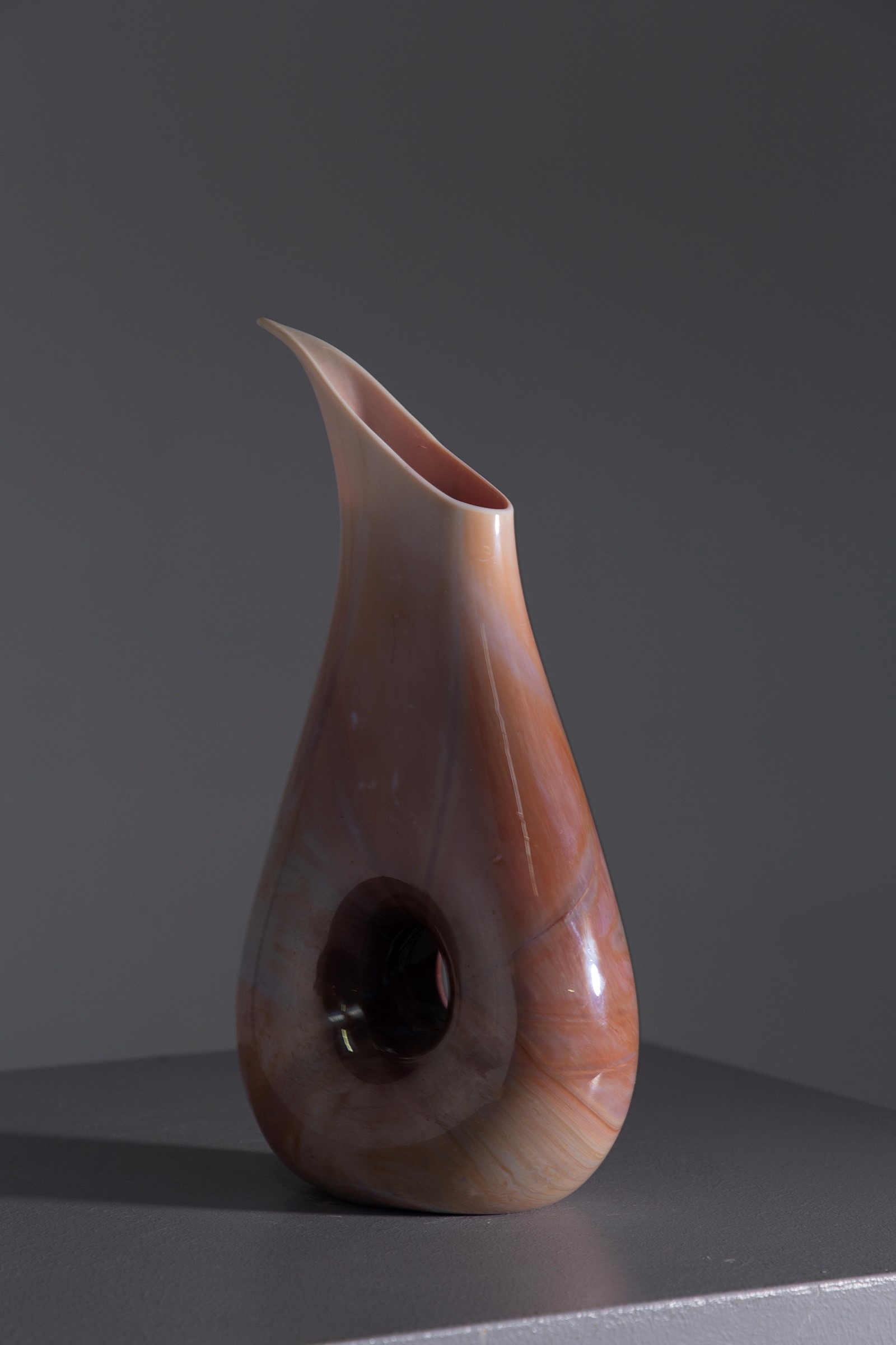 Vaso in vetro calcedonio della manifattura Aureliano Toso - Barovier. 1950. La bocca a forma di brocca è stilizzata a forma di foglia.