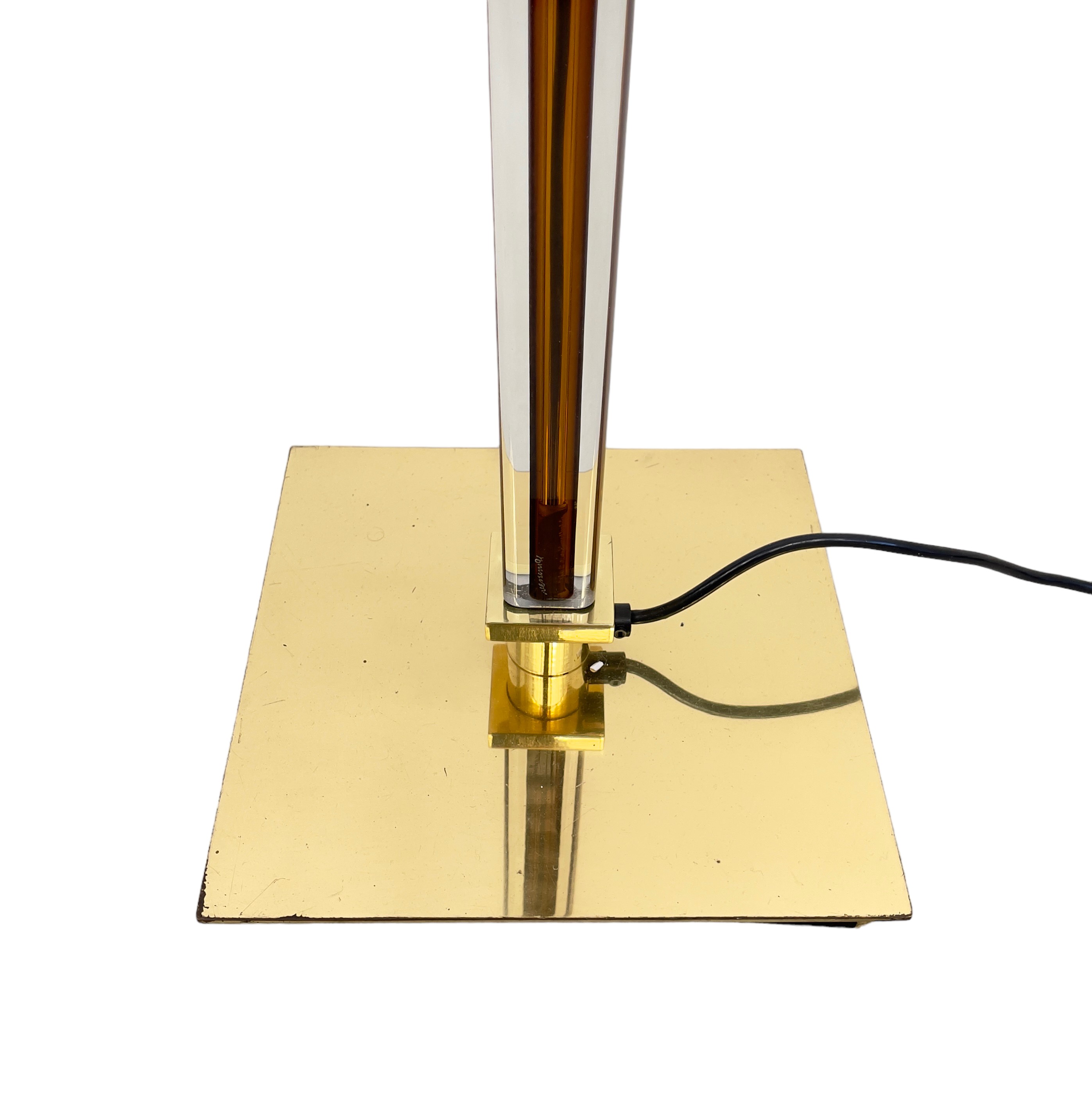 Lampada da terra modello Tolboi con diffusore in vetro soffiato, cristallo trasparente e ambra scura. Asta in vetro sommerso trasparente. Giunti e base in ottone. Venini, Murano, 2001