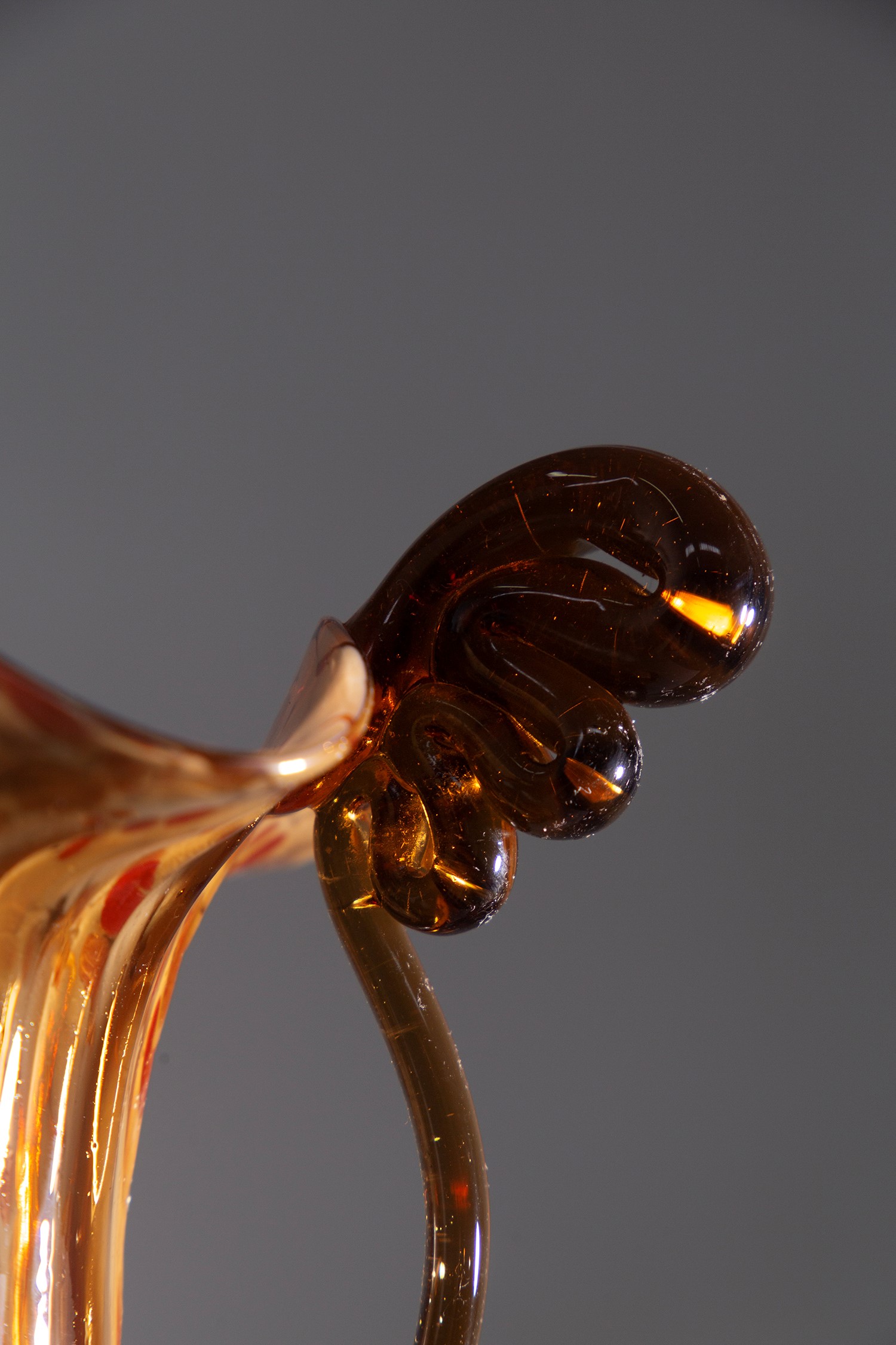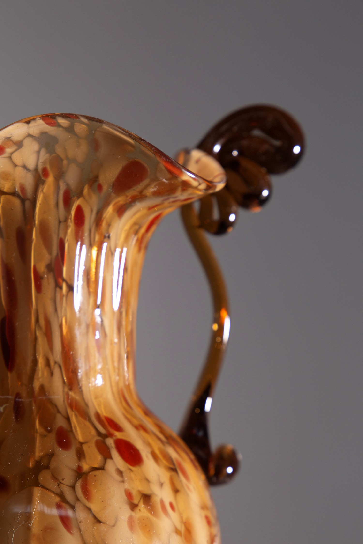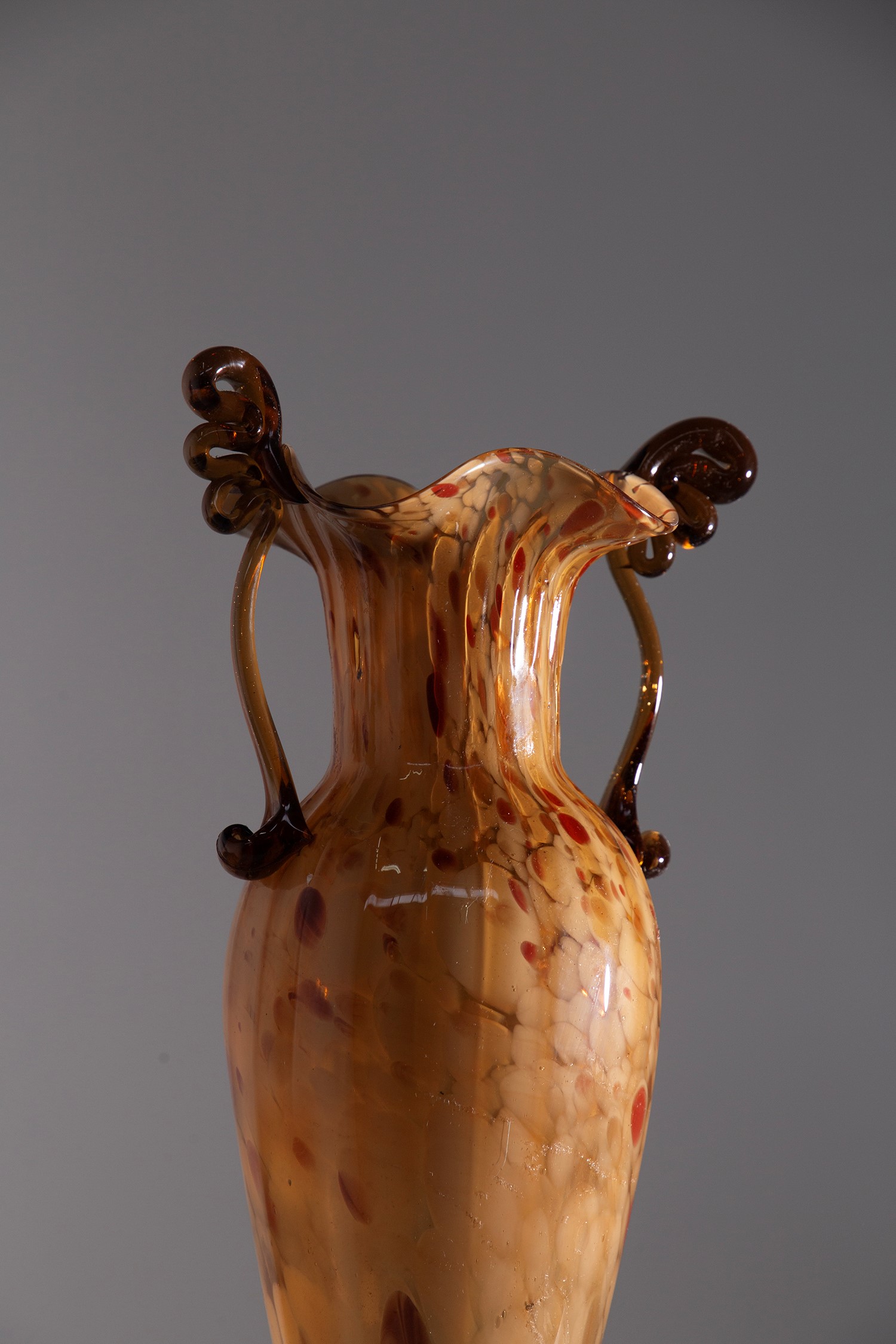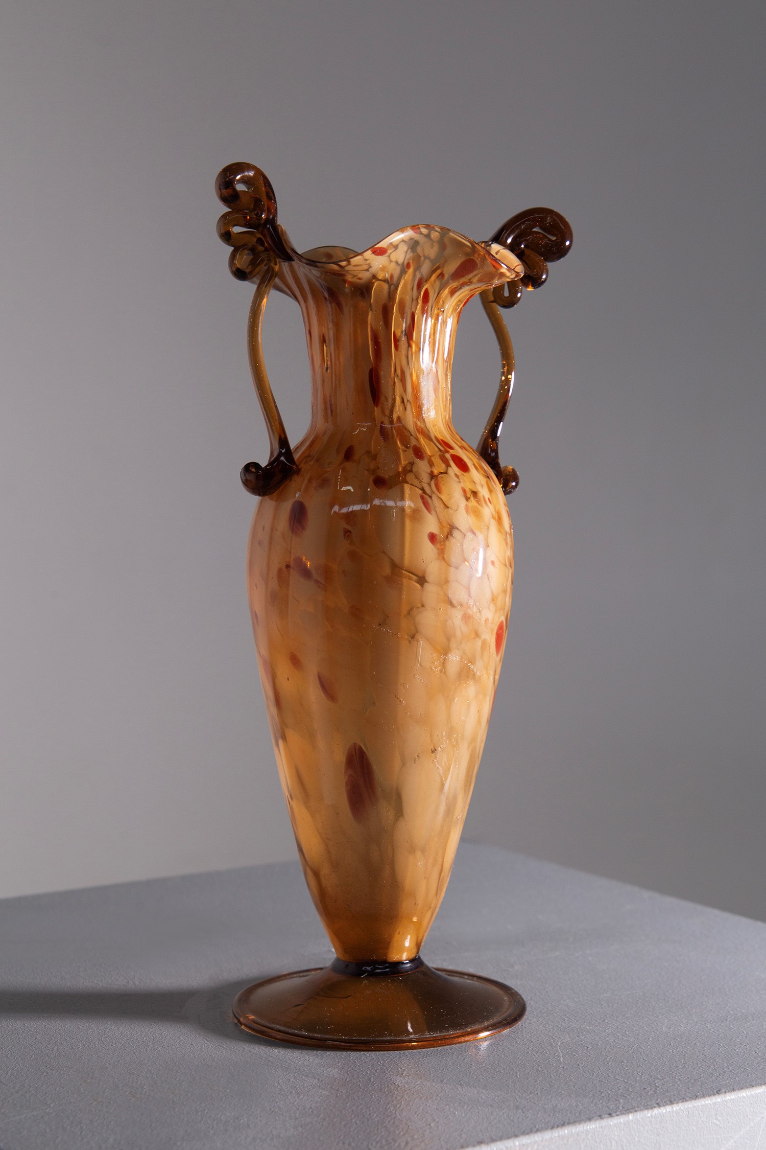 Vaso in vetro di Murano disegnato dai Fratelli Toso negli anni '20. Il vetro soffiato è di colore ambrato con sfumature rosso scuro.