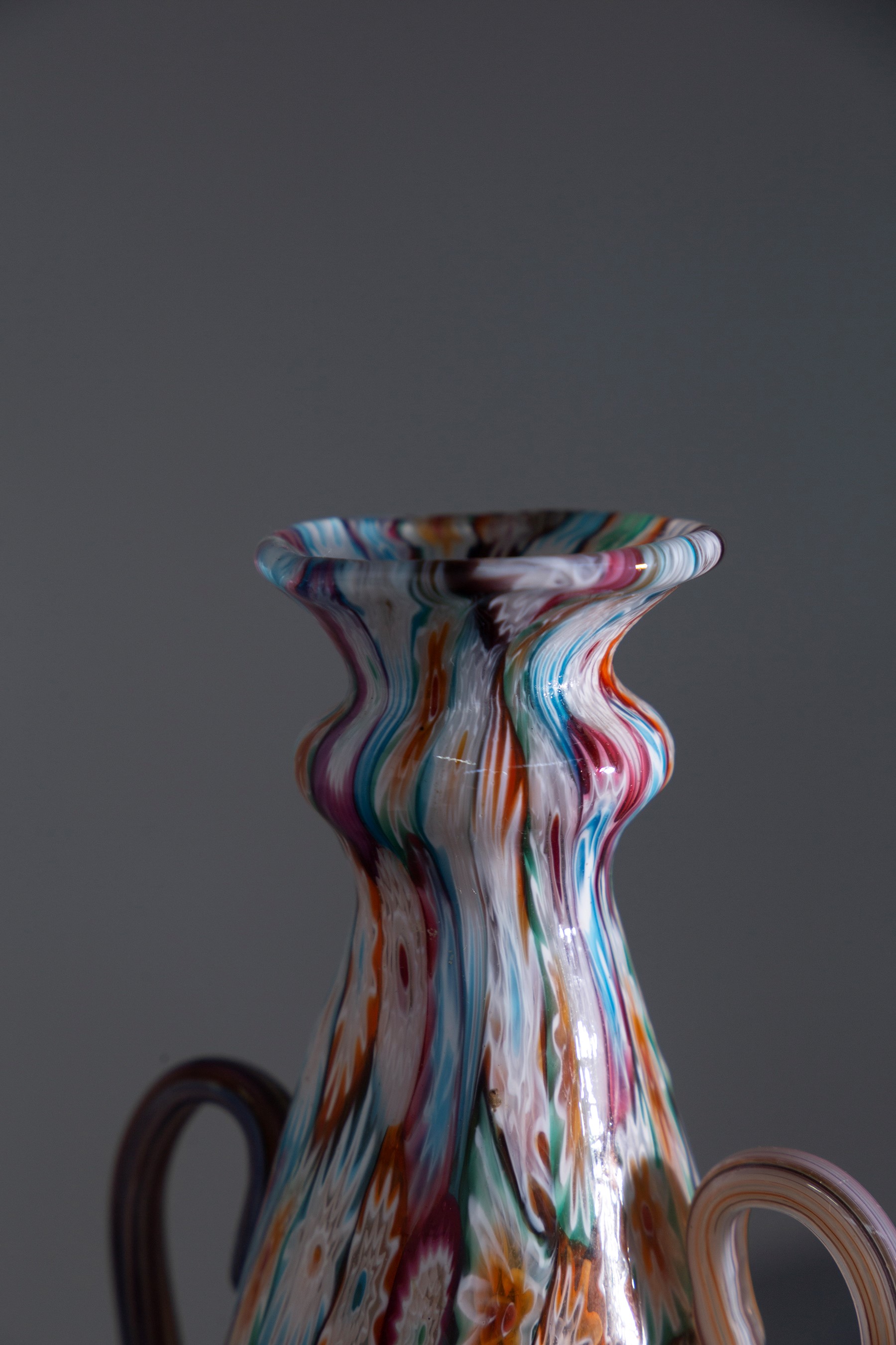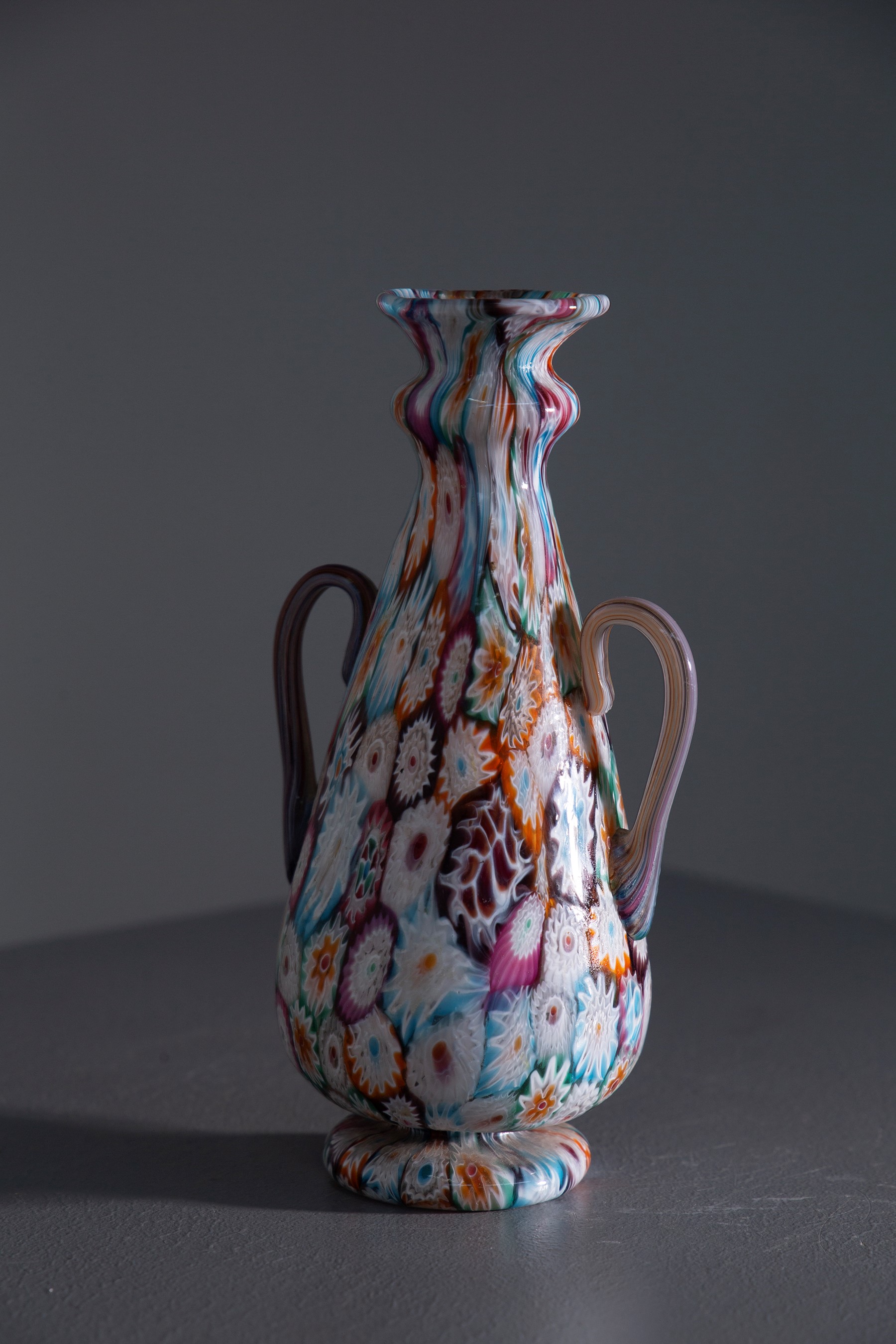 Vaso decorativo in vetro di Murano dei Fratelli Toso, datato tra il 1900 e il 1920. Decorato con tecnica millefiori, con murrine a 6-7 strati di colore. Dotato di bordo svasato e manici ornamentali.