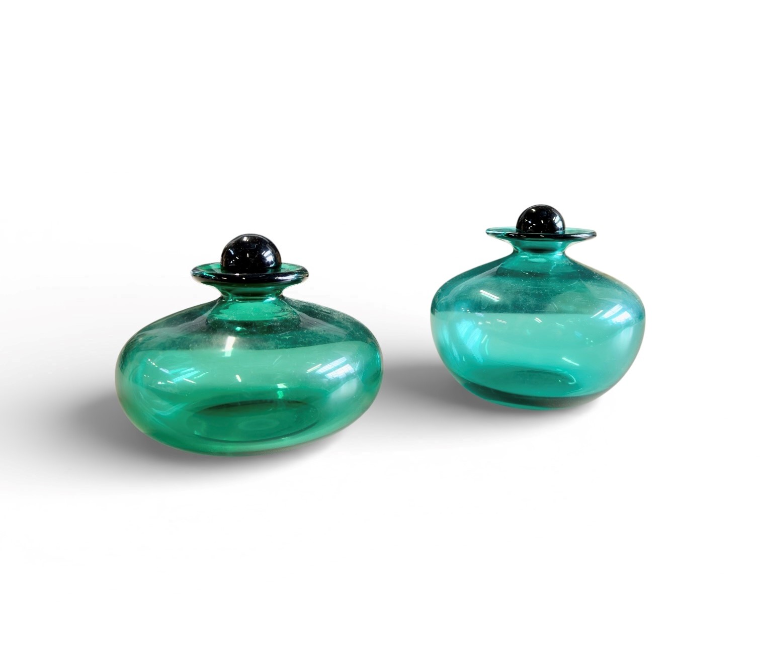 Coppia di vasi in vetro artistico di Murano con tappo a sfera nero, realizzati da Marcello Furlan. Italia 1988. Presente data e firma alla base.