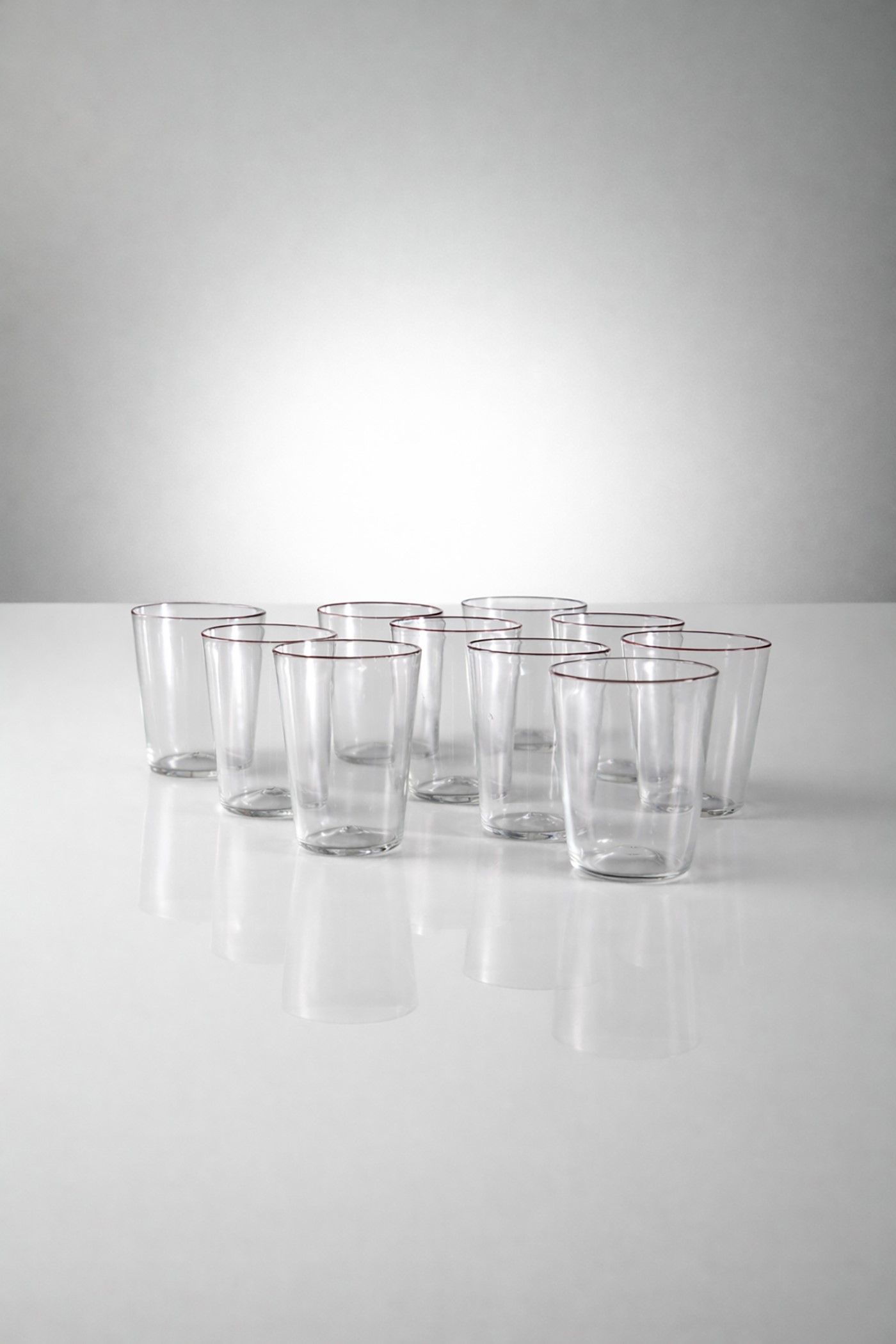 Set di 10 bicchieri Carlo Scarpa produzione Venini Cappelin con bordo bordo rosso ametista, fine anni 20.