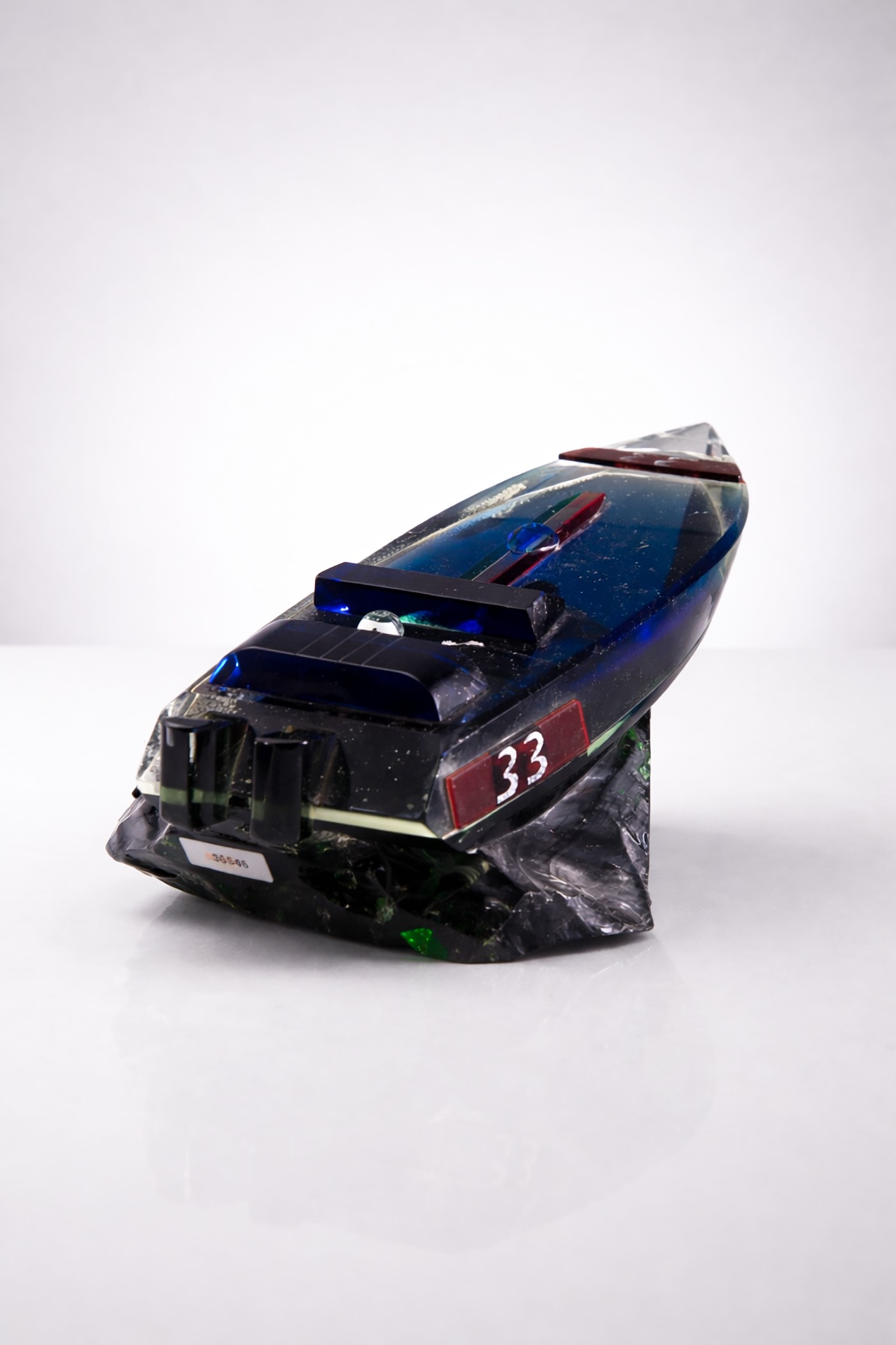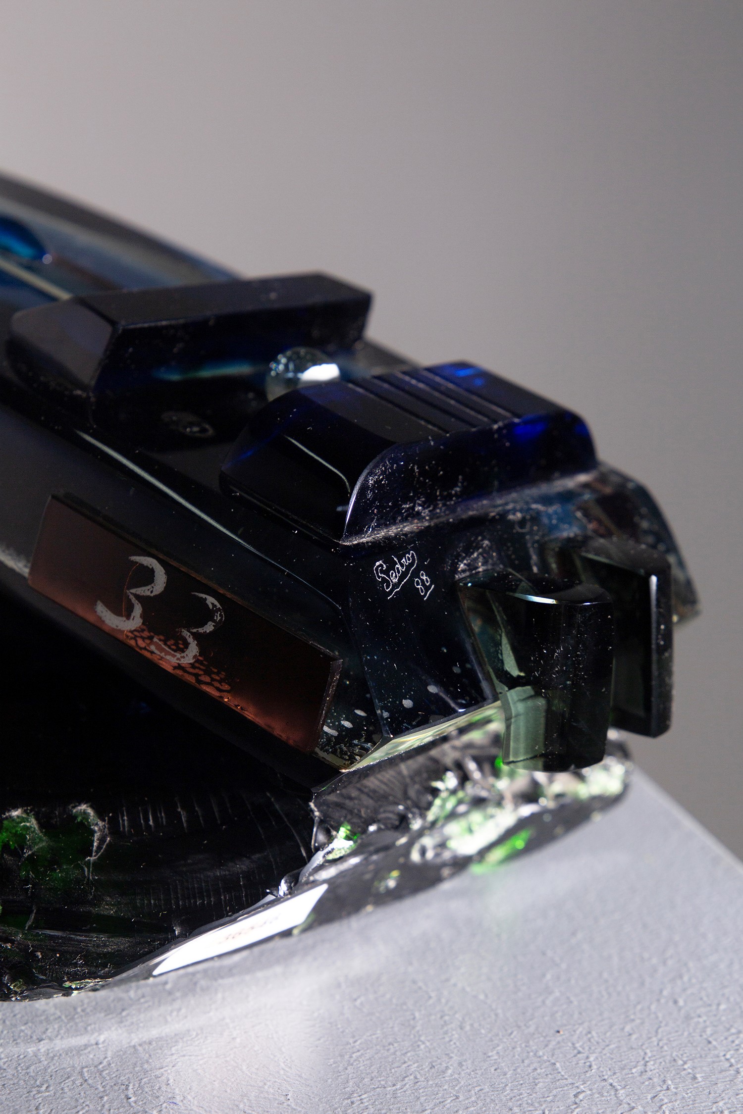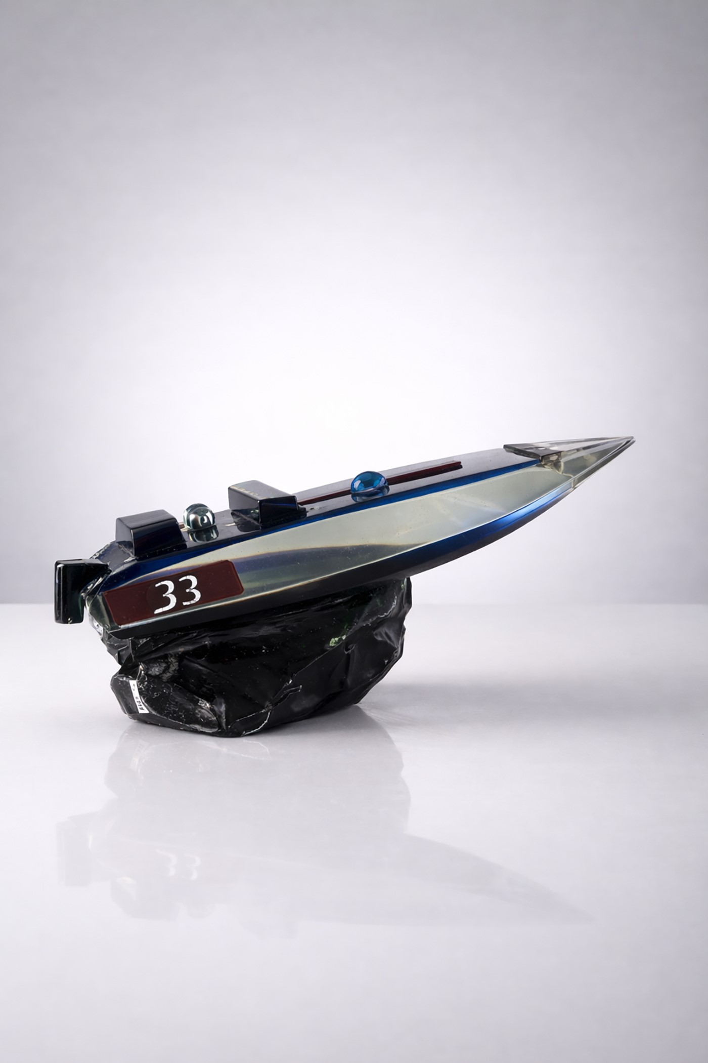 Scultura in vetro raff. ''OFFSHORE''. Produzione SEGUSO. Firmato Ferrari Club, Milano. Con dedica a Mike Bongiorno (noto conduttore tv italiano che era appassionato di offshore). Anni '80.