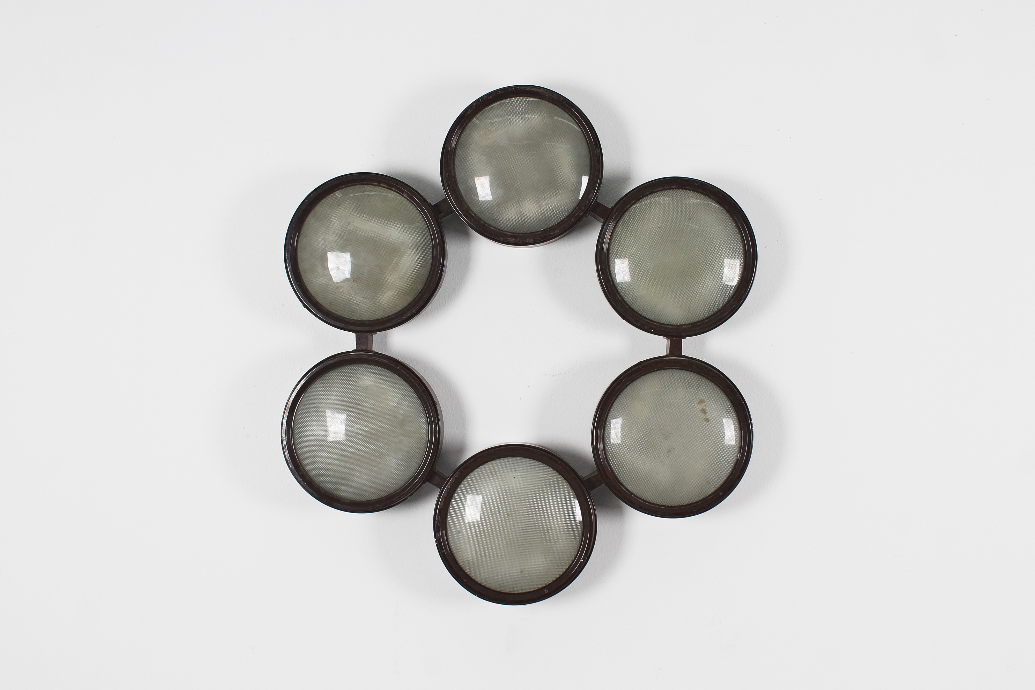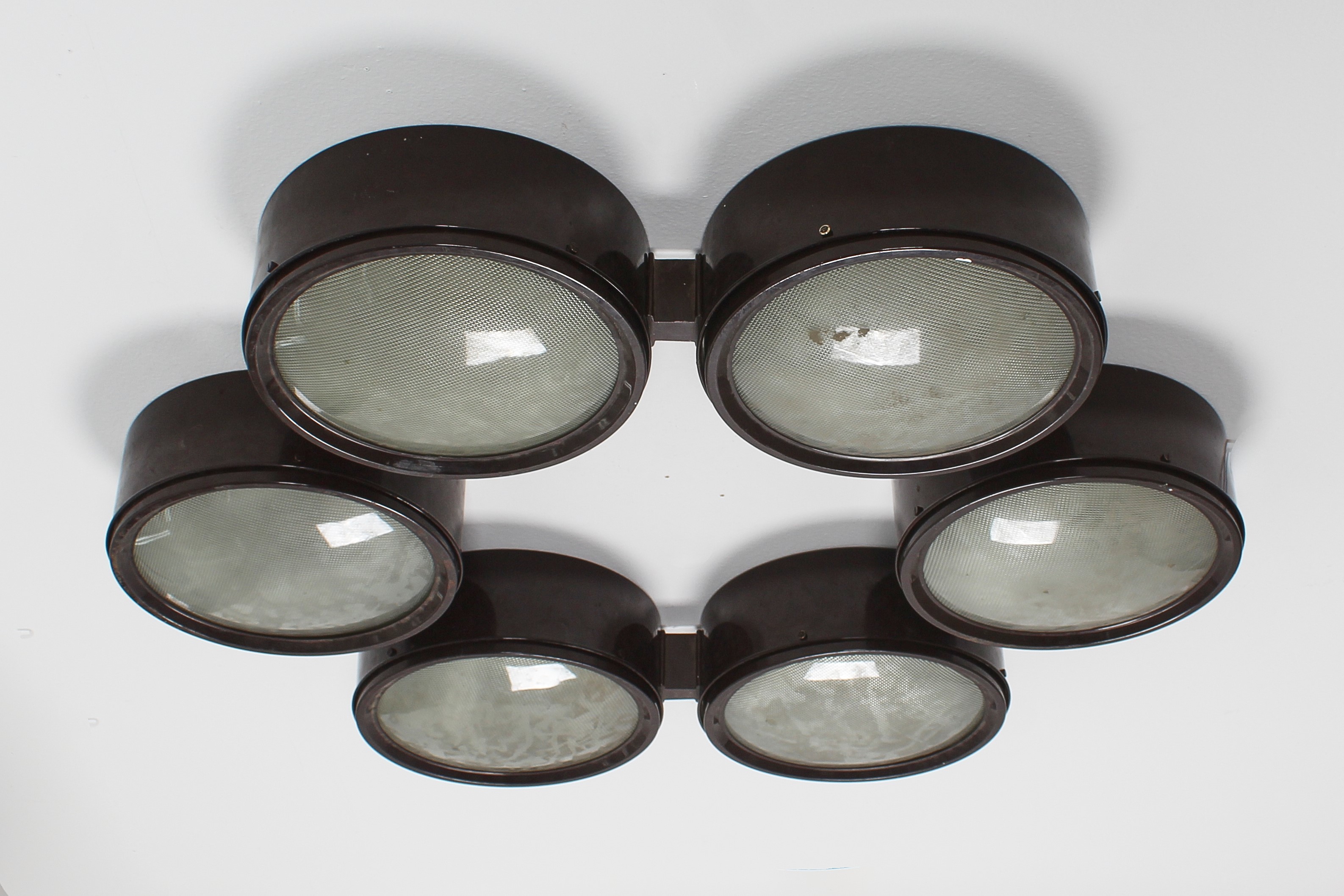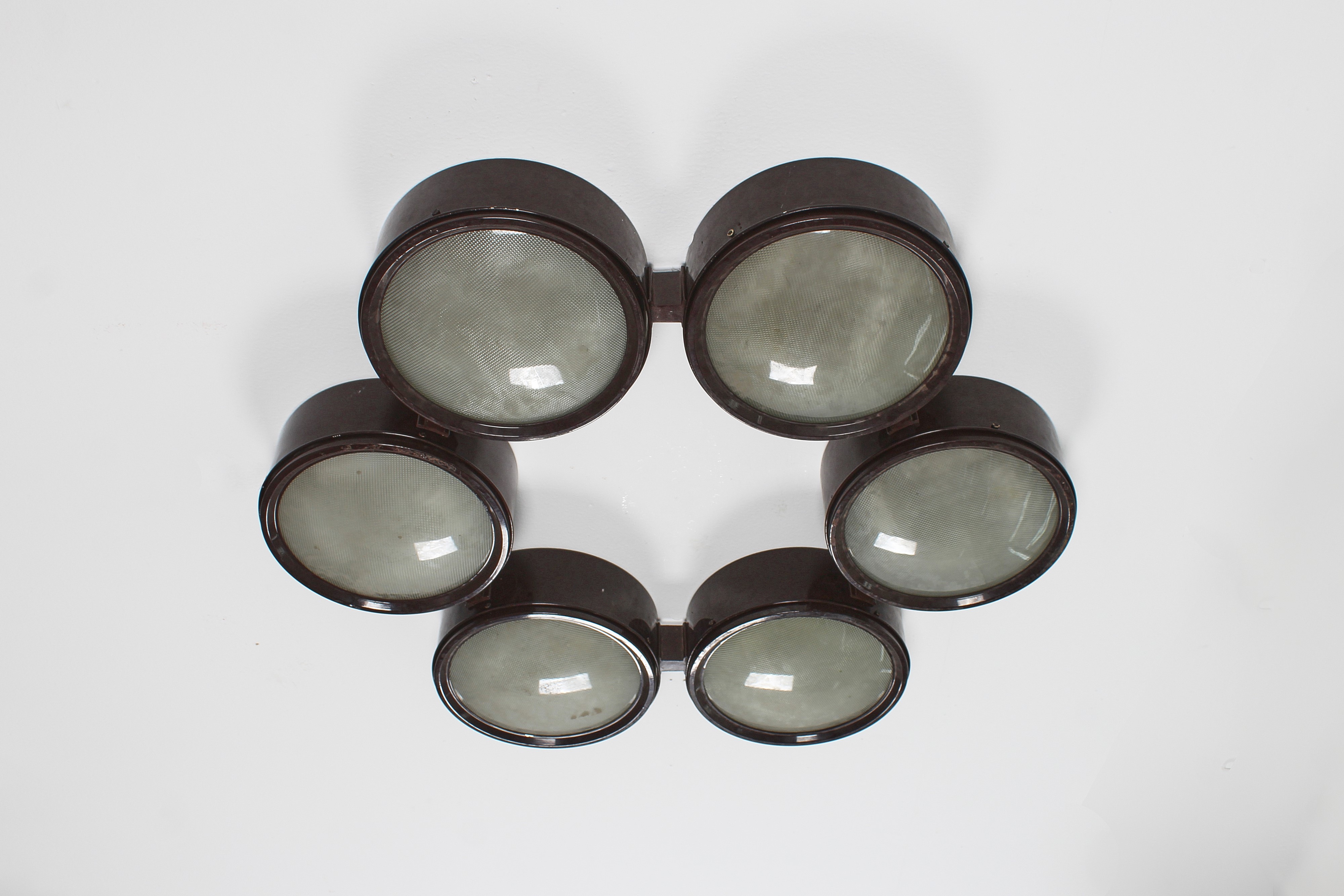 Lampada a soffitto, variante del modello "2045/a", progettata dallo studio BBPR e prodotta da Arteluce negli anni '60. Sei diffusori circolari in alluminio verniciato e vetro pressato/curvato. Logo Arteluce all'interno.