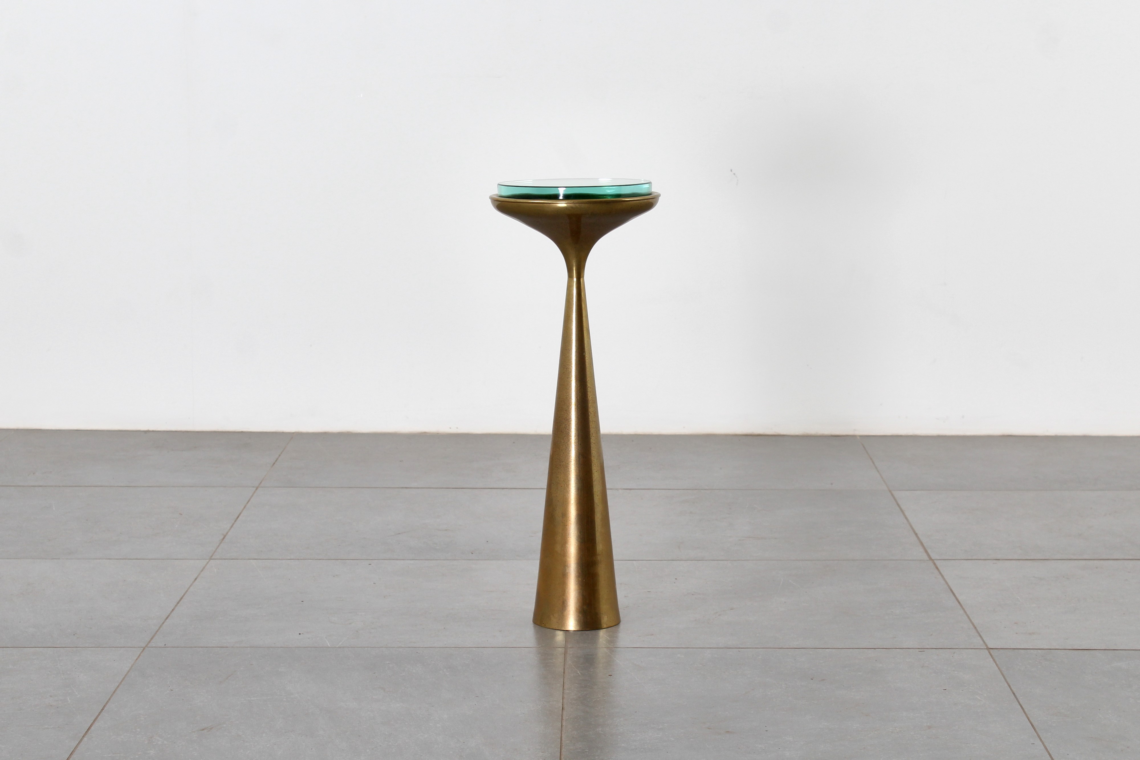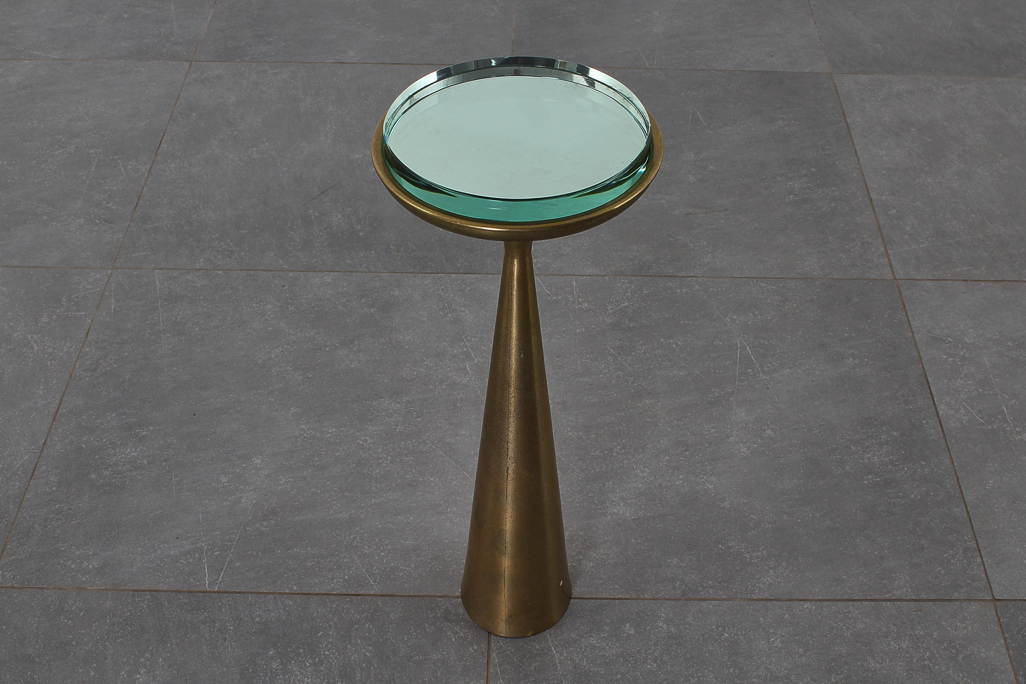 Tavolino mod. 1776. Ottone, cristallo colorato molato e specchiato. Produzione Fontana Arte anni '50.