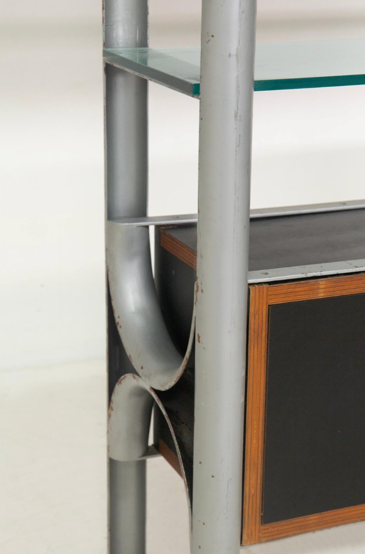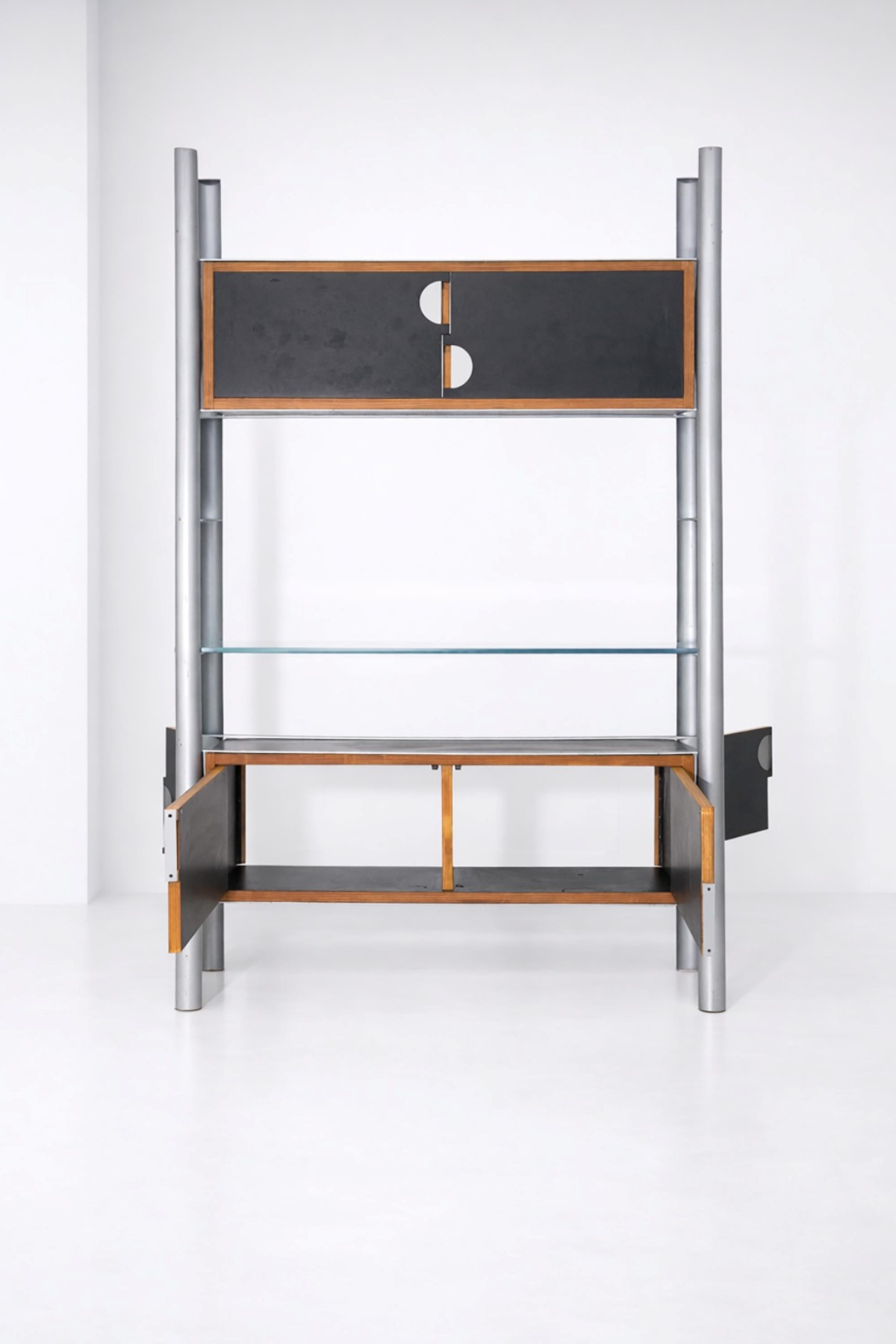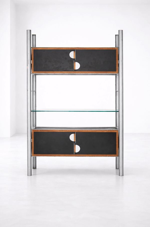 Unico pezzo. Prototipo Libreria della serie “FerroTipi” , disegnato da G.Malacrida & P. Resmini 1968. Struttura in ferro laccata e due vani in legno che si aprono con ante tramite maniglie in acciaio che fungono da contenitori.