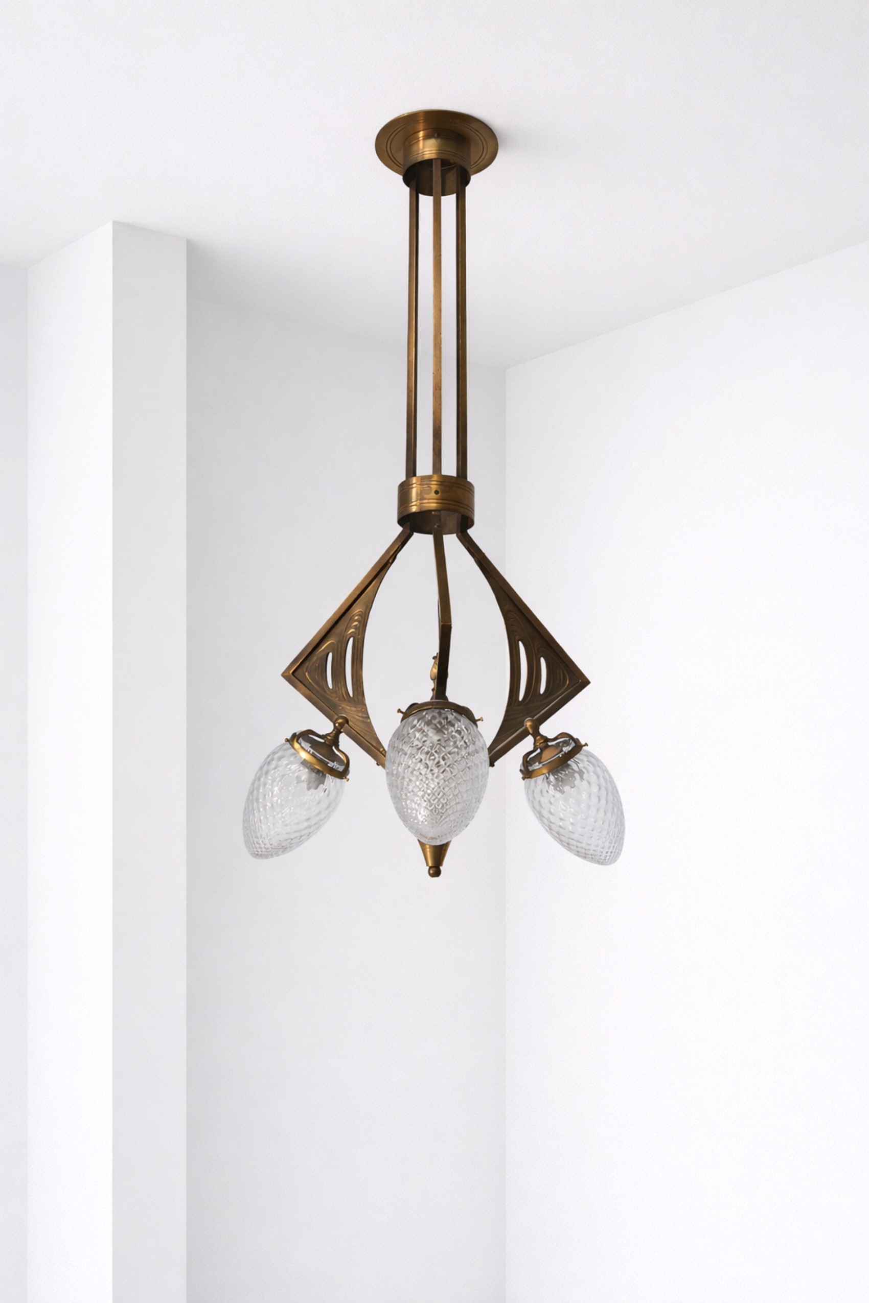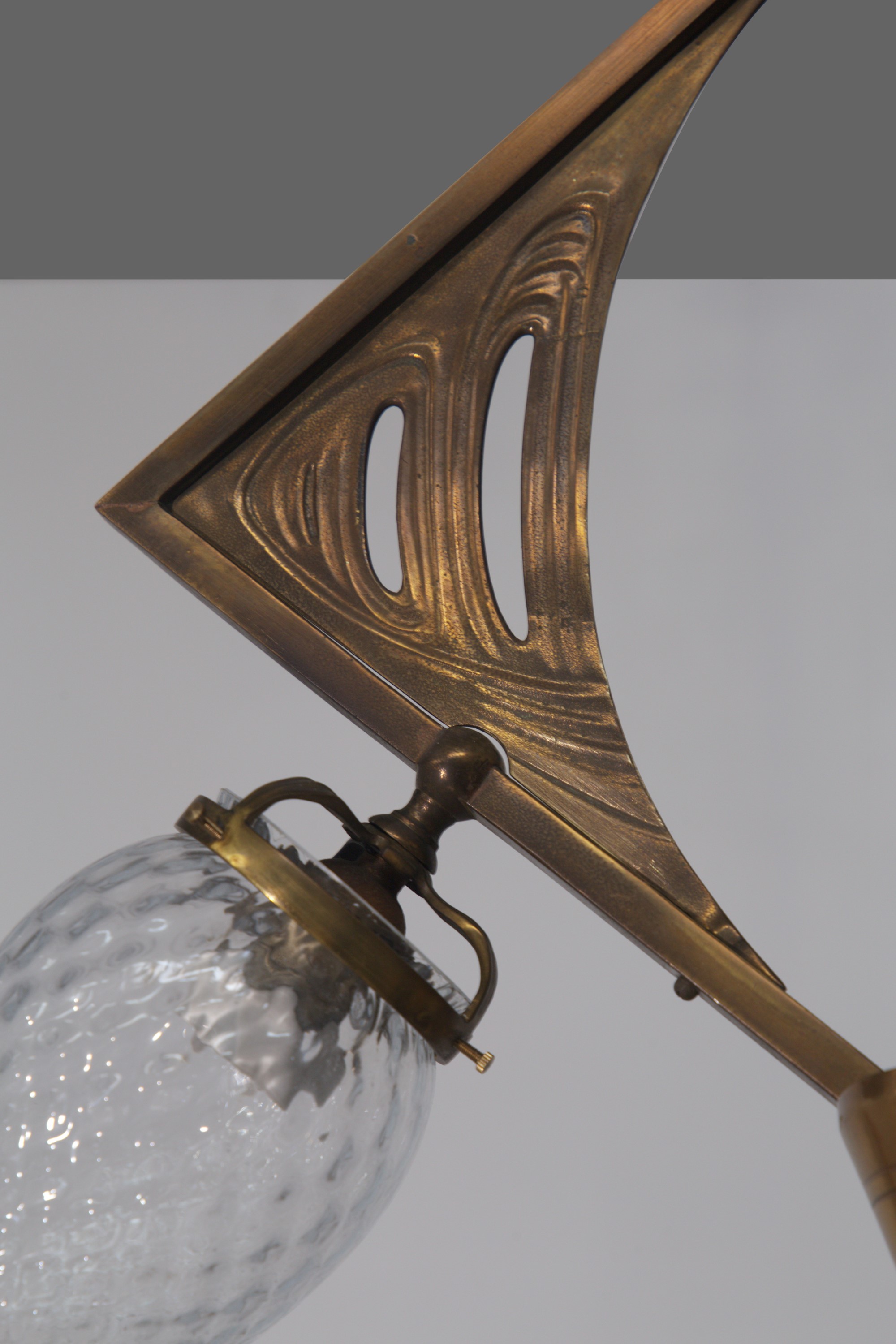 Lampadario Art Nouveau italiano anni 20 in ottone lavorato. Paralumi in vetro