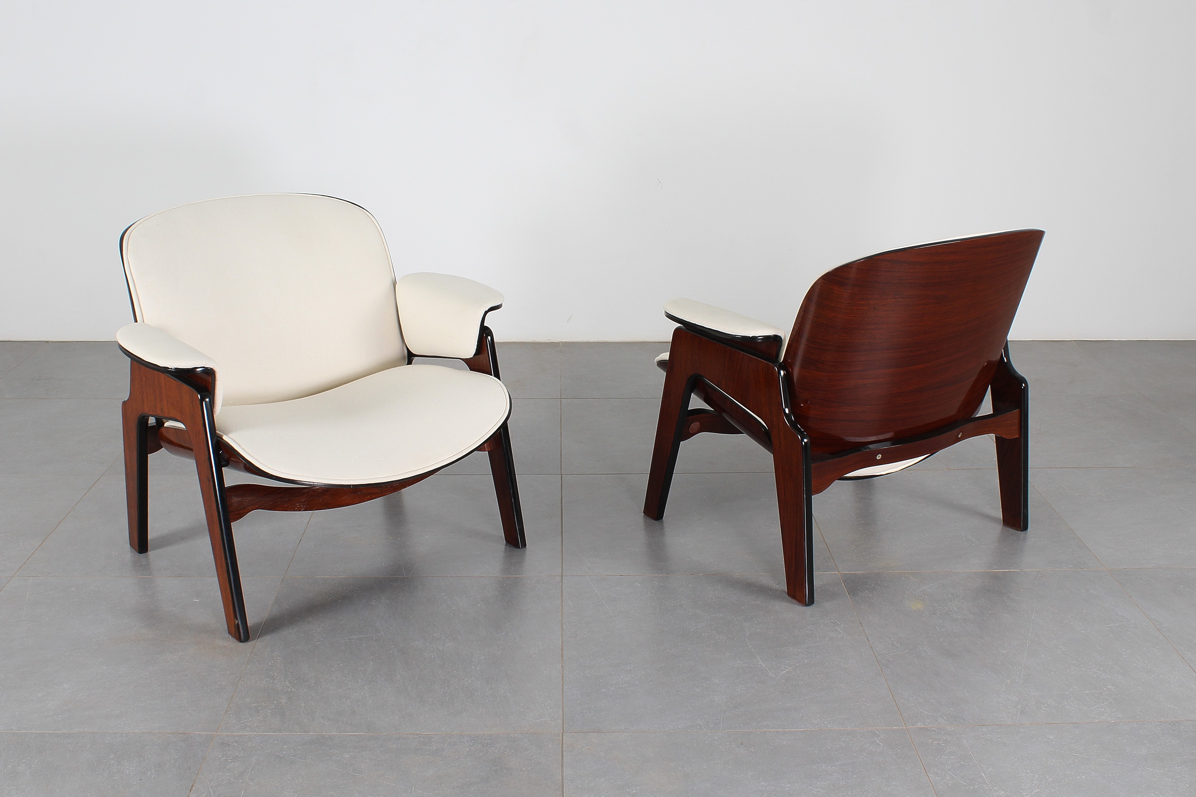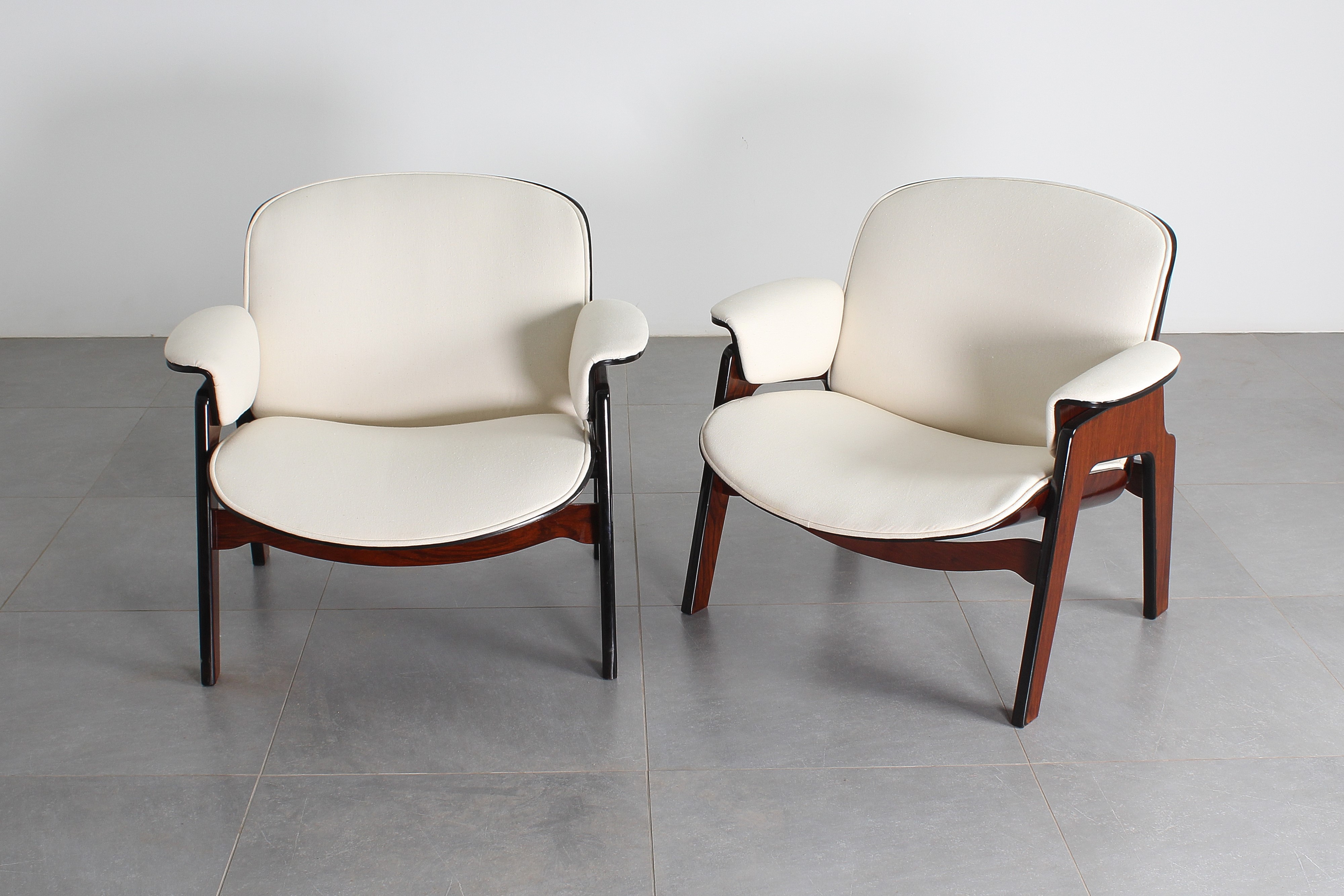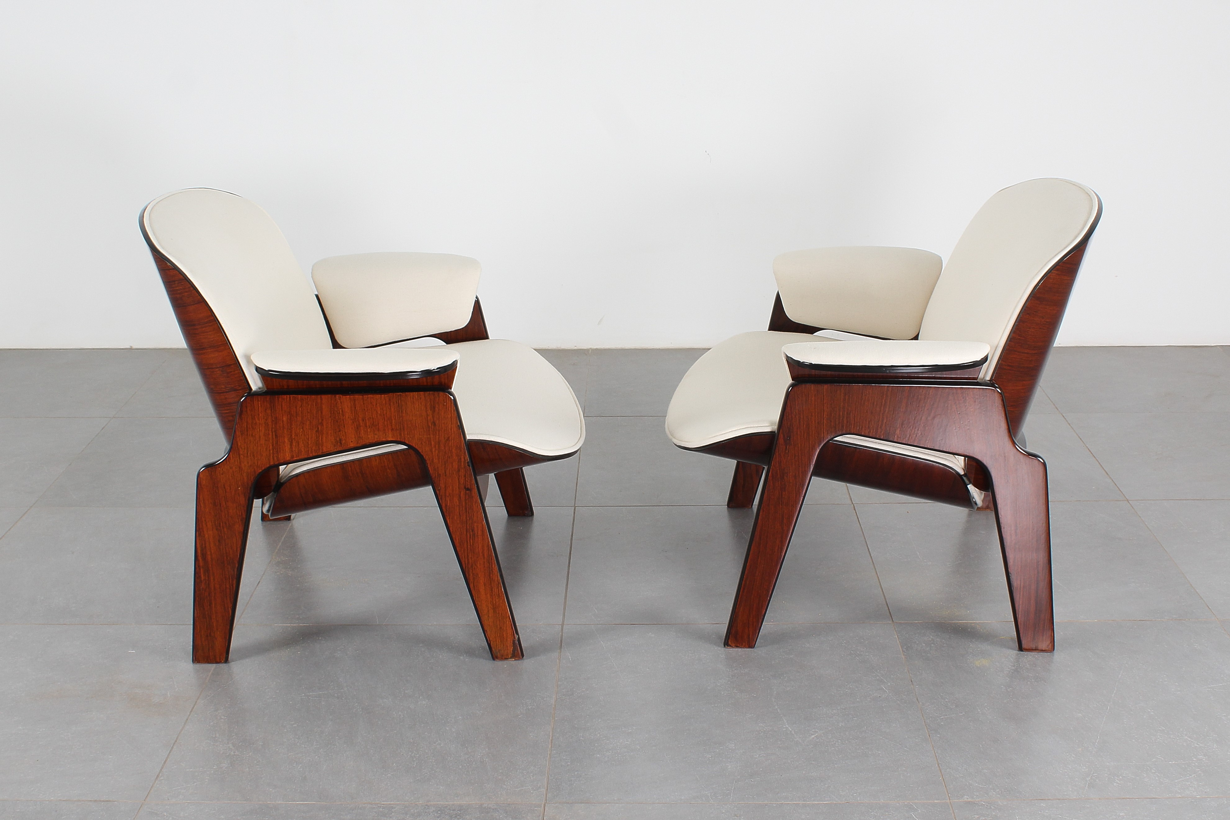 Coppia di poltrone in compensato curvato, impiallacciato, sedile e schienale rivestiti in tessuto bianco. Prod. MiM, Italia Anni '60