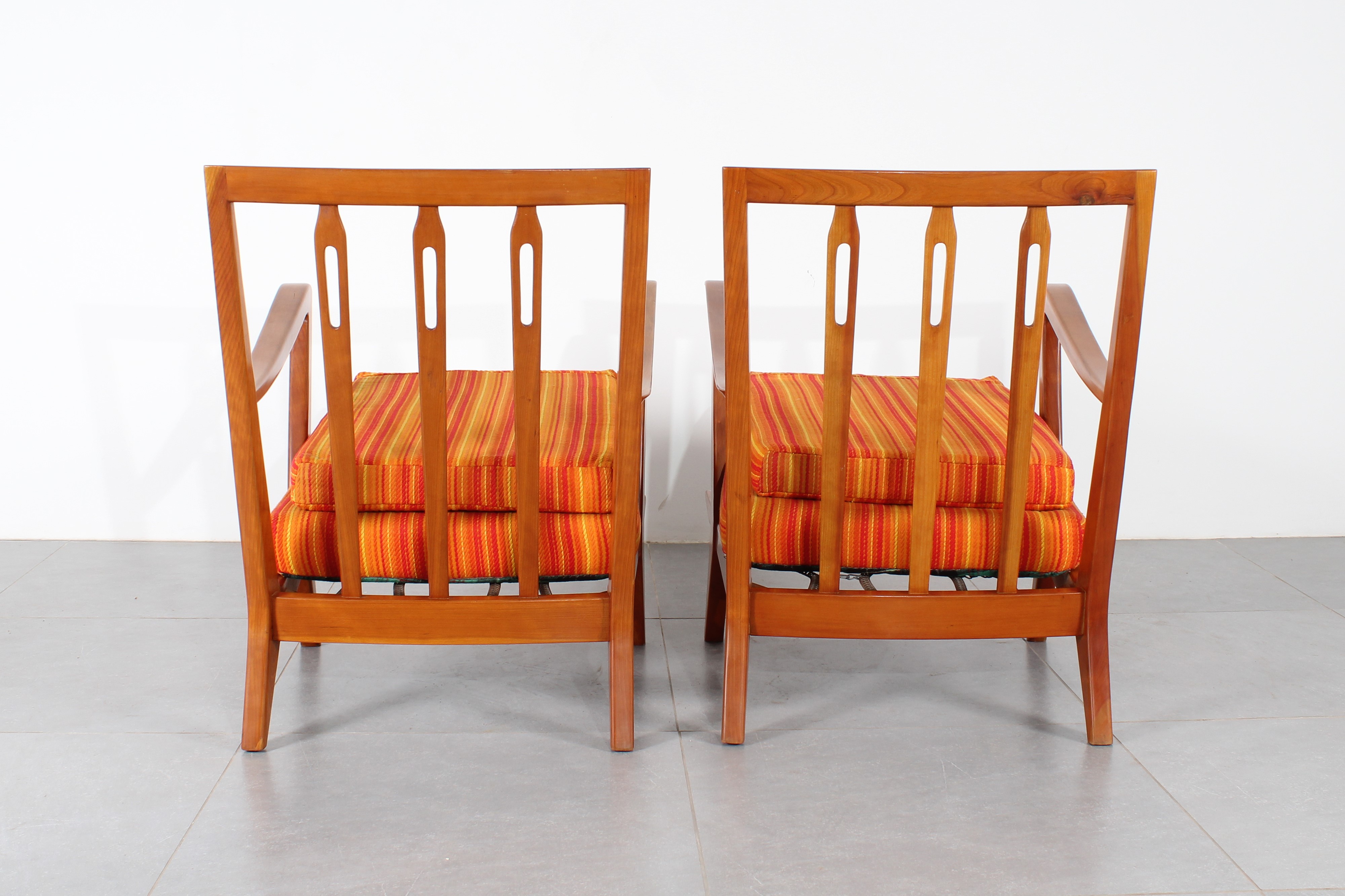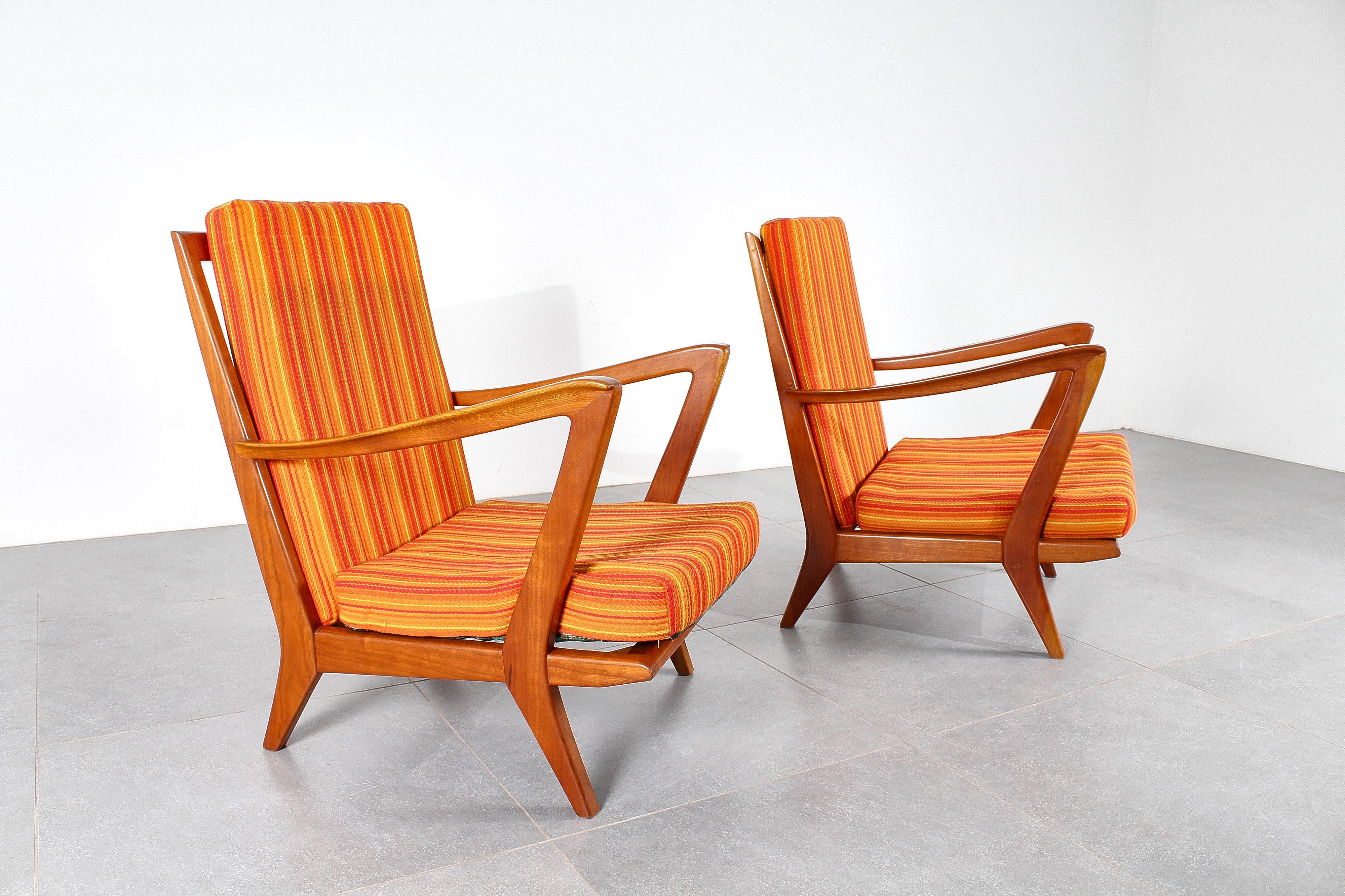 Coppia di poltrone mod. 516 di Giò Ponti per Cassina, anni '50. Struttura in legno sagomato, metallo e fodera a righe nelle tonalità dell'arancio.