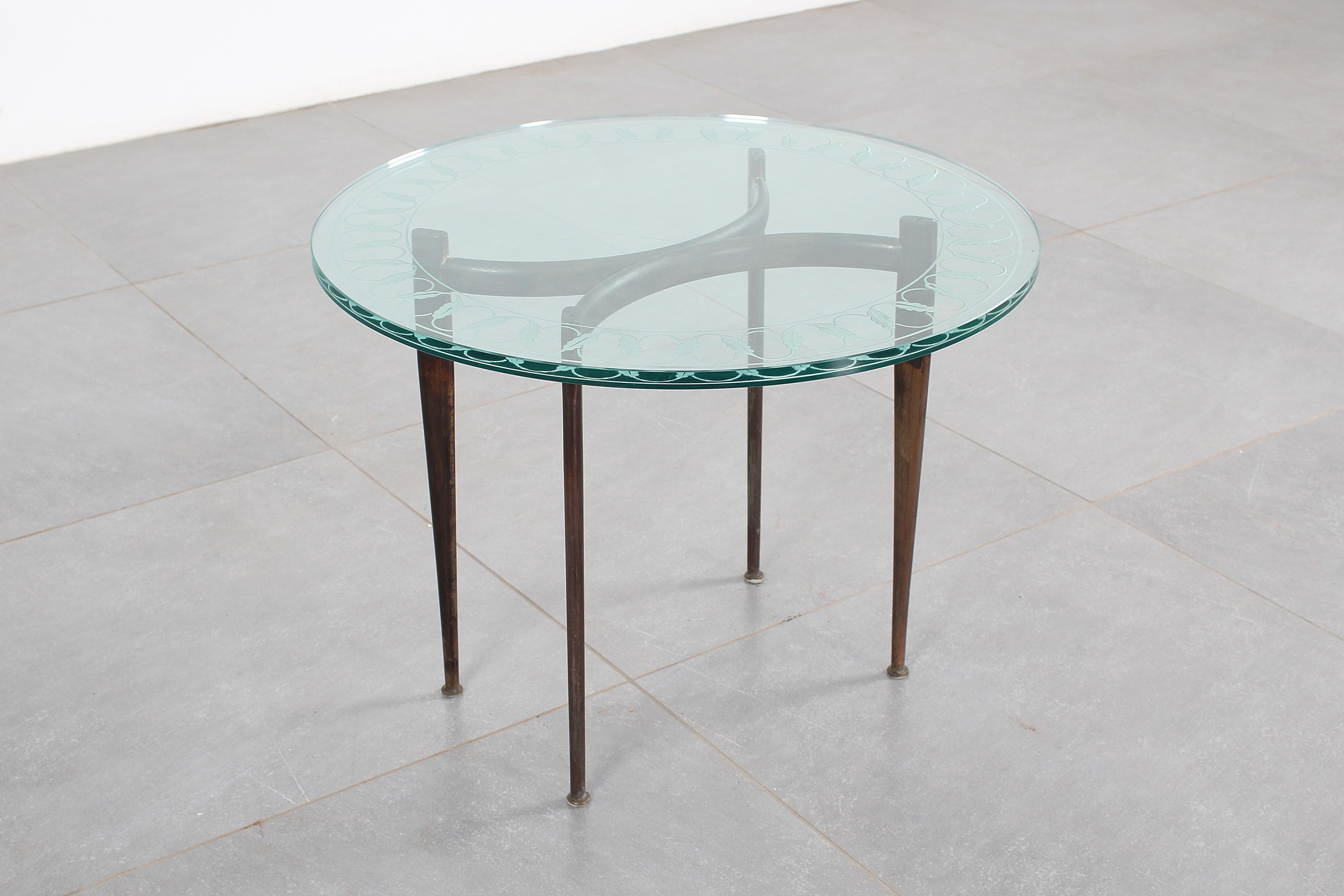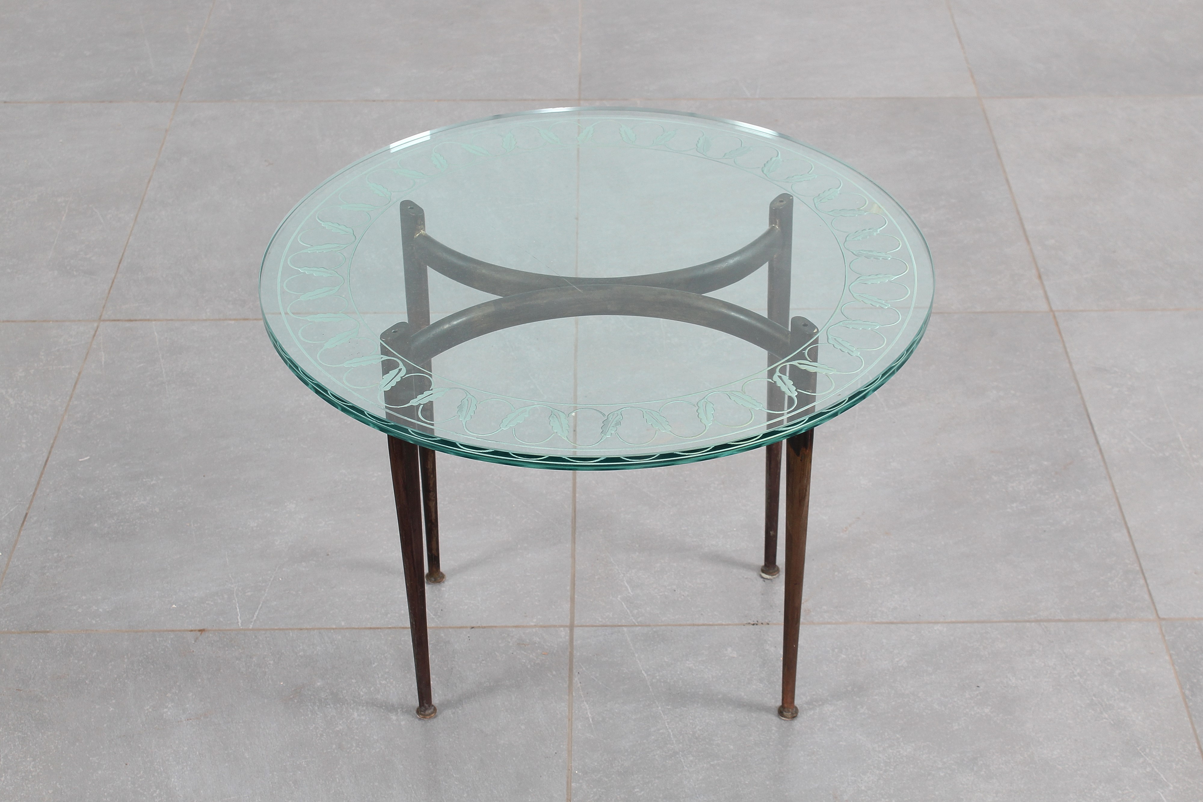 Low brass table with tapered legs and a thick circular glass top featuring engraved decorations. Made in the 1940s.