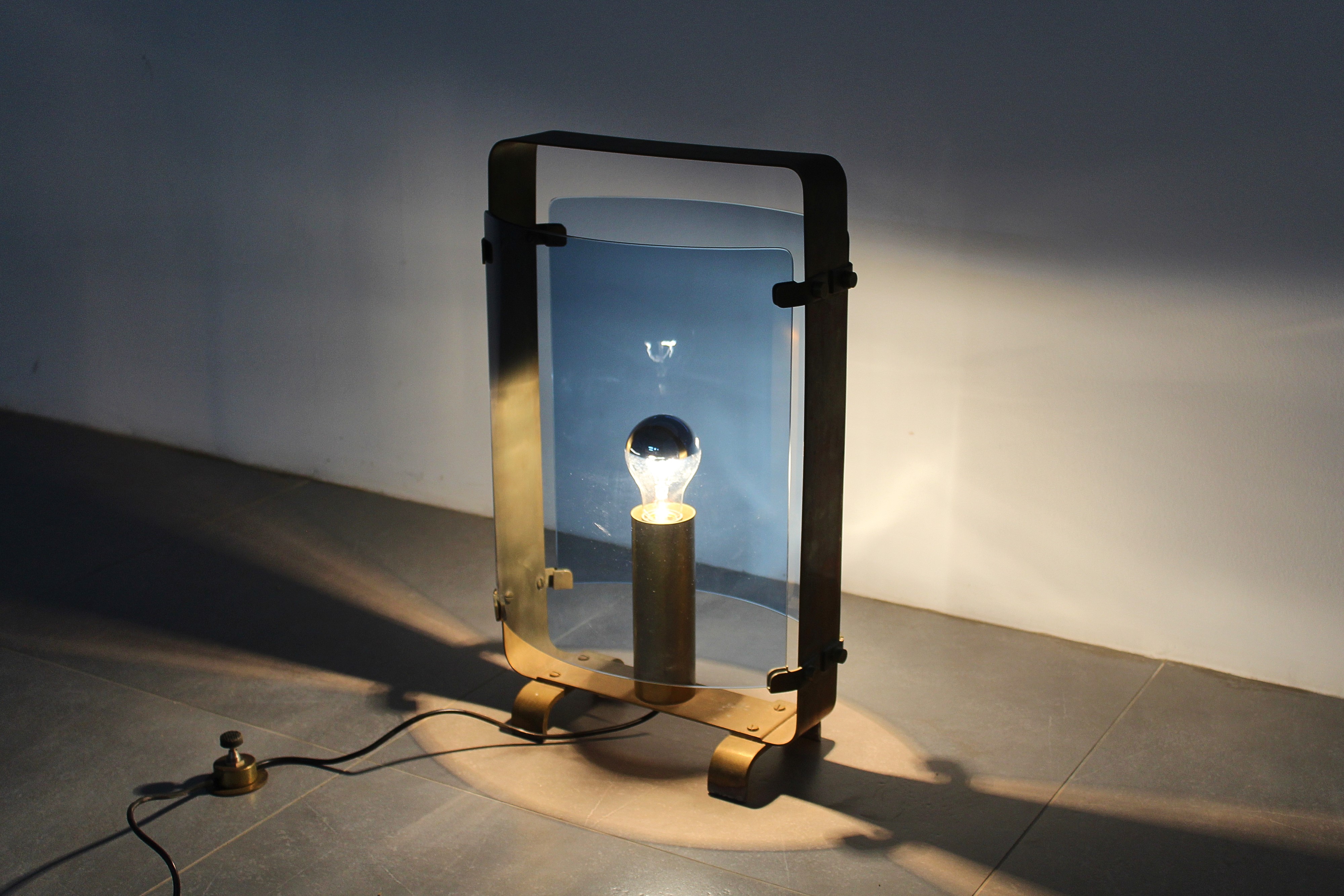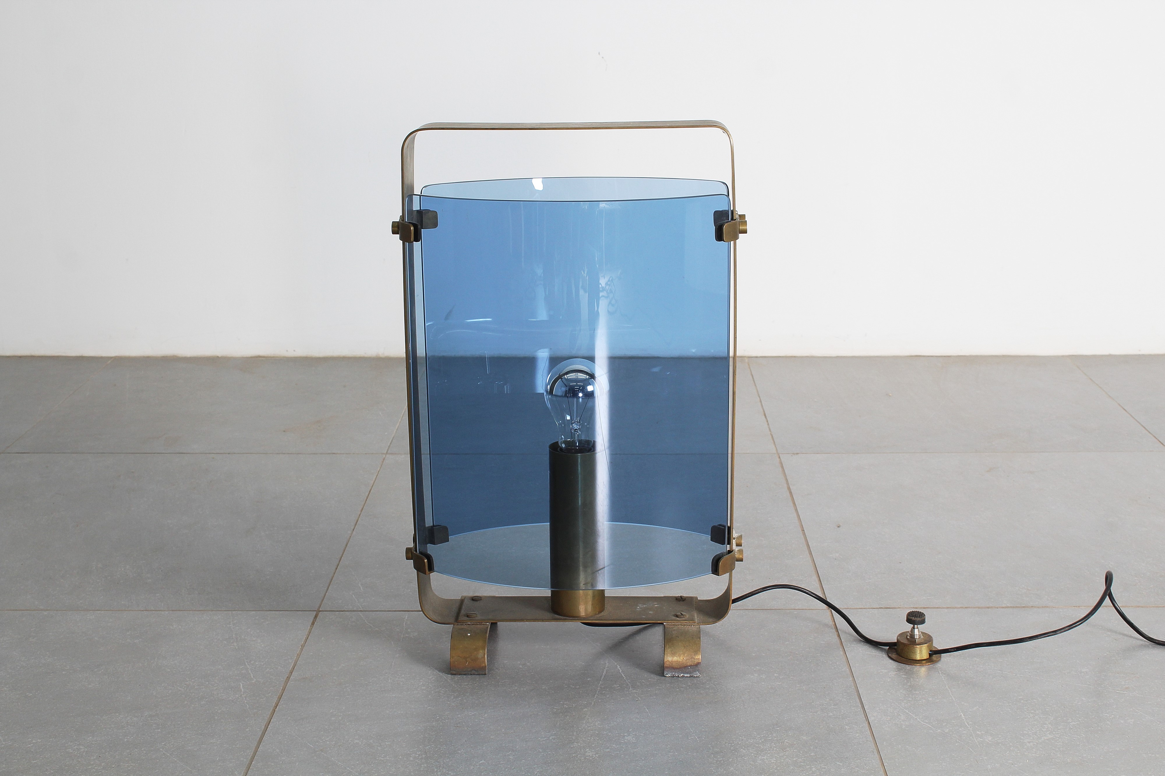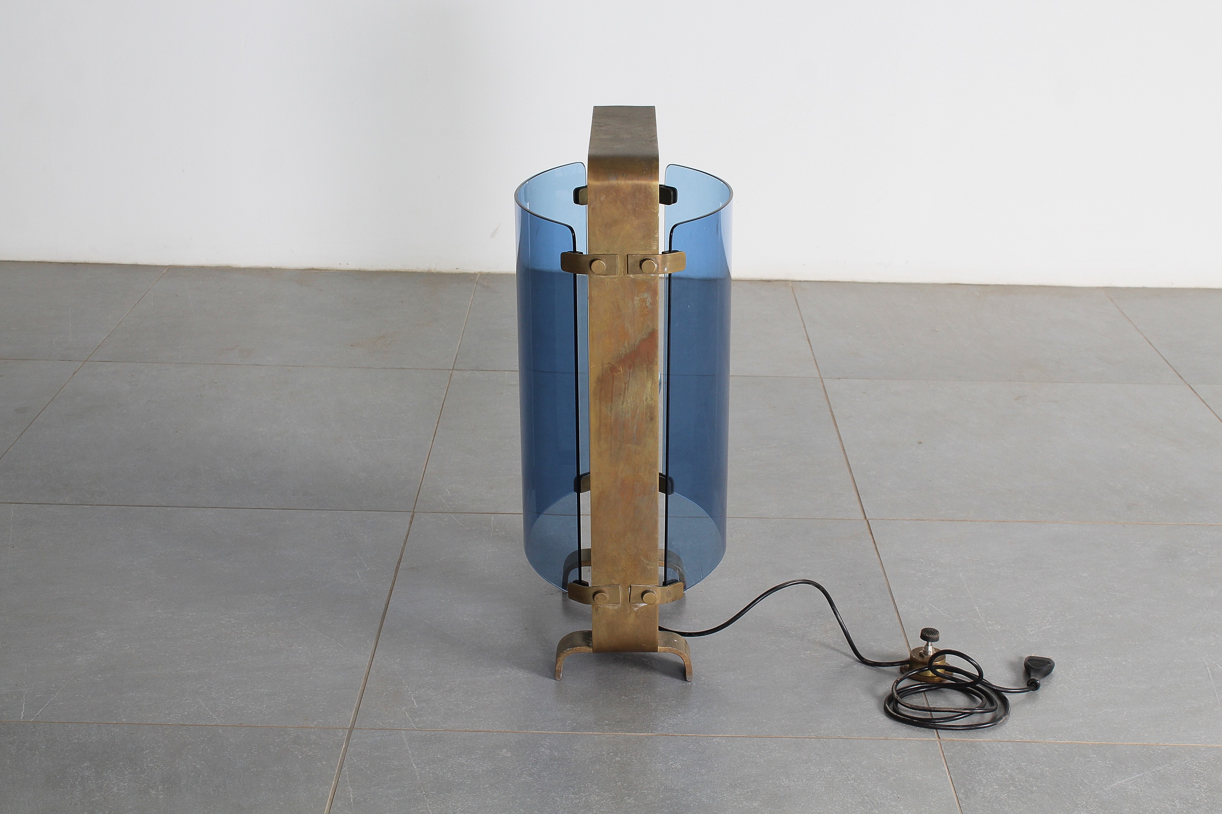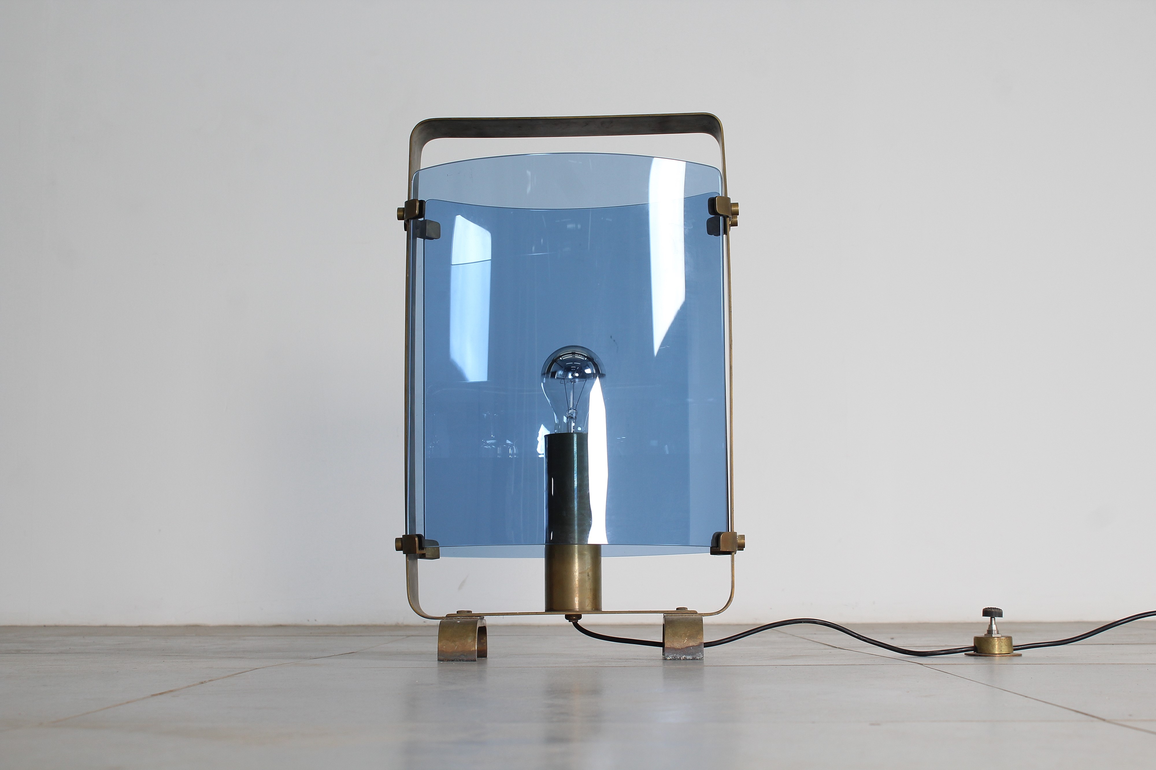 Floor lamp in brass and curved blue glass. Manufactured by Fontana Arte, Italy, circa 1960.
