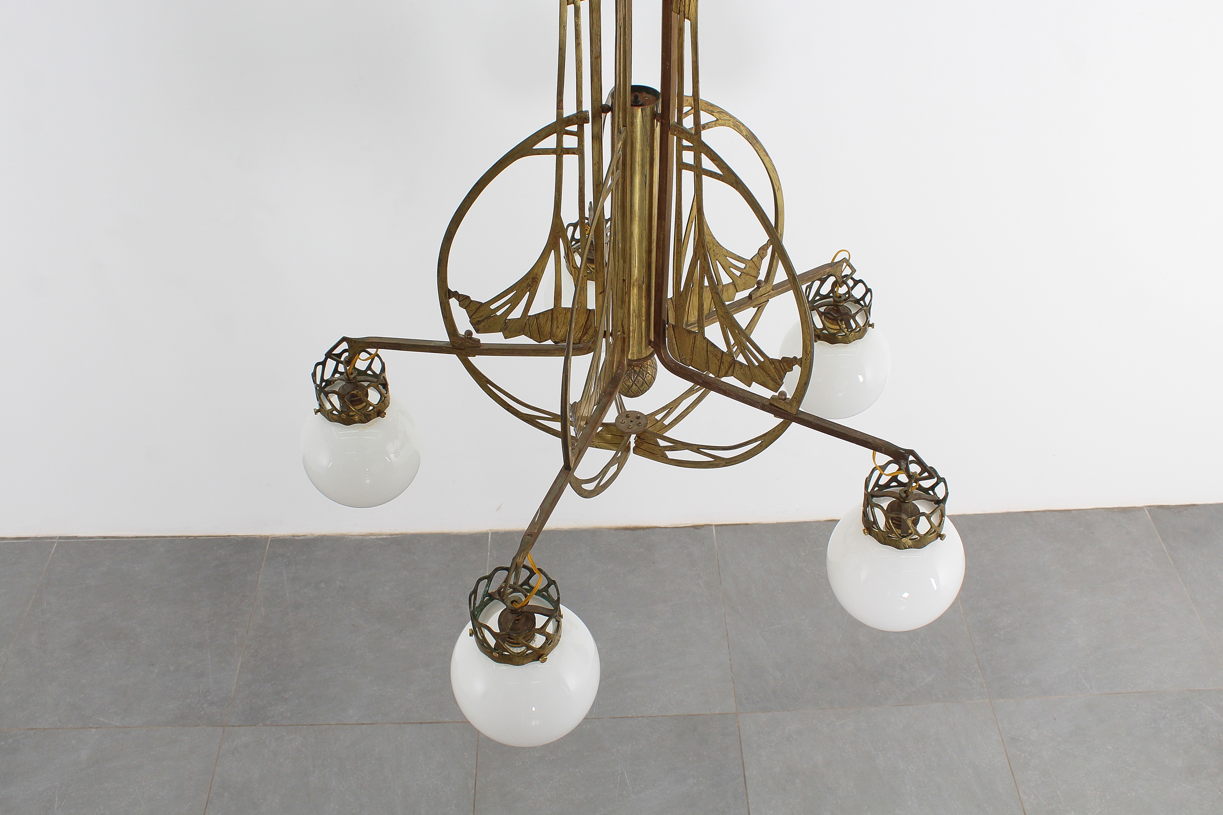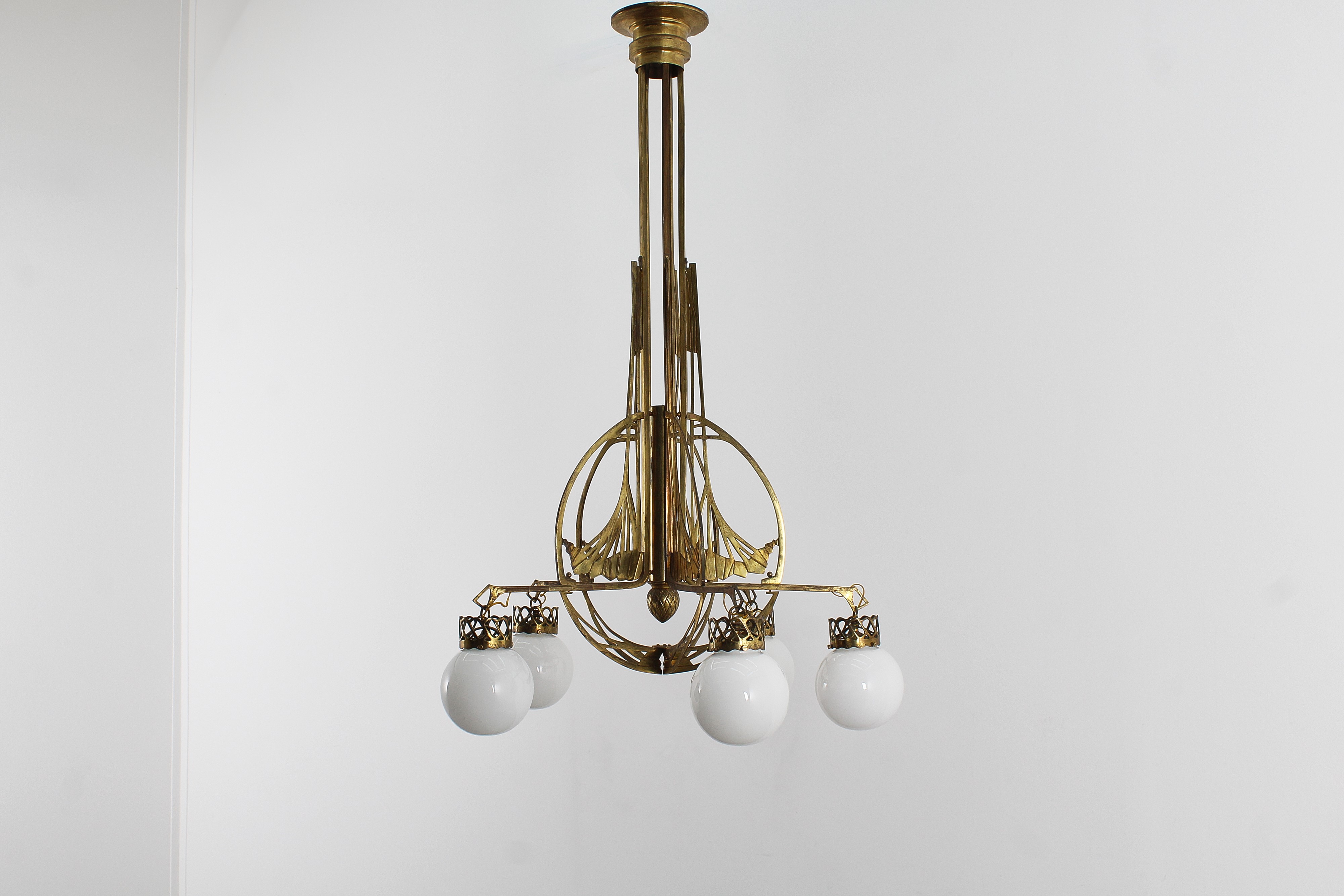 Five-arm Art Nouveau brass chandelier, featuring elaborate decorative motifs and opal glass globes. Made in Vienna, Austria, in the late 19th century.